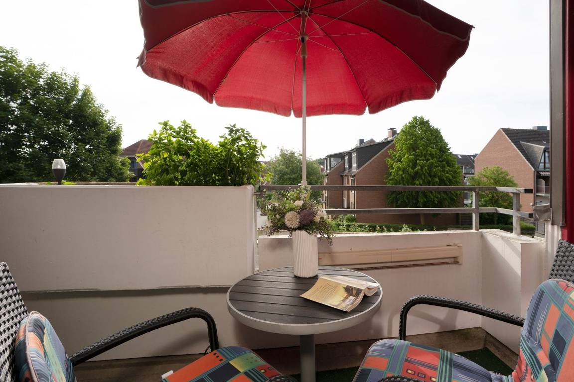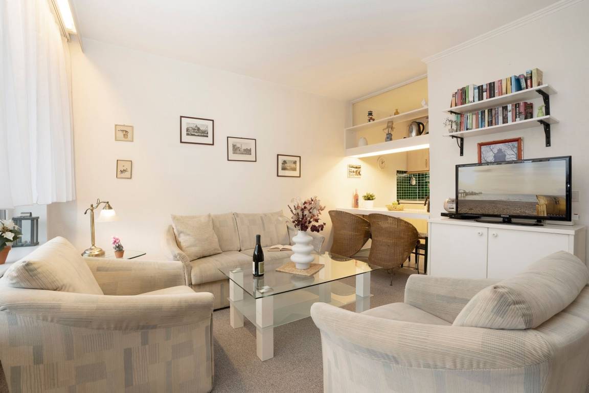 Hell und gemütlich eingerichtet erwartet Sie ein kombinierter Wohn- und Schlafraum. Das komfortable Schrankbett (2x 80x 200 cm) und ein bequemer Schlafsessel (80x200 cm) dienen als Schlafmöglichkeiten im Wohnbereich. Die gut ausgestattete Küche z. B. mit Mikrowelle mit Back- und Grillfunktion ist geschlossen, aber durch einen Küchentresen mit Sitzmöglichkeit mit dem Wohnbereich verbunden. Das innenliegende Badezimmer verfügt über eine Badewanne. Auf dem überdachten und möblierten Balkon können Sie die Morgensonne beim Frühstück genießen.