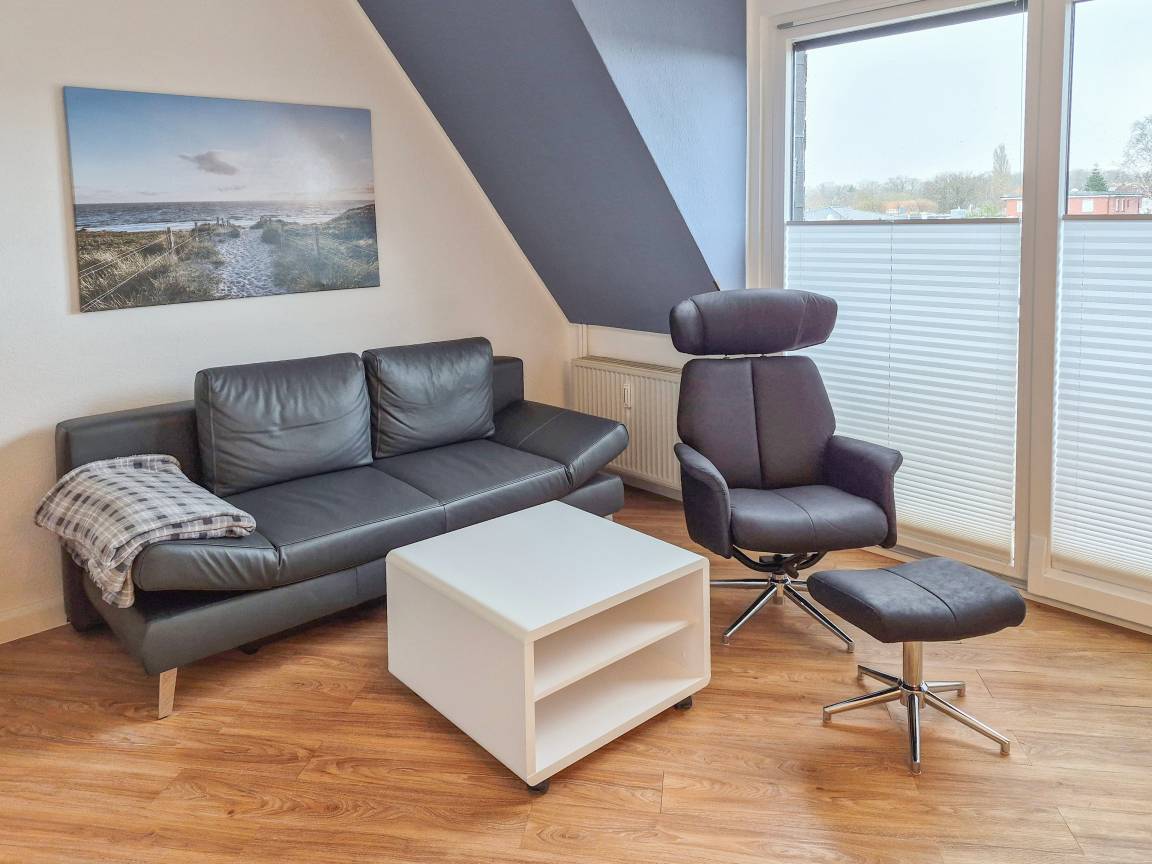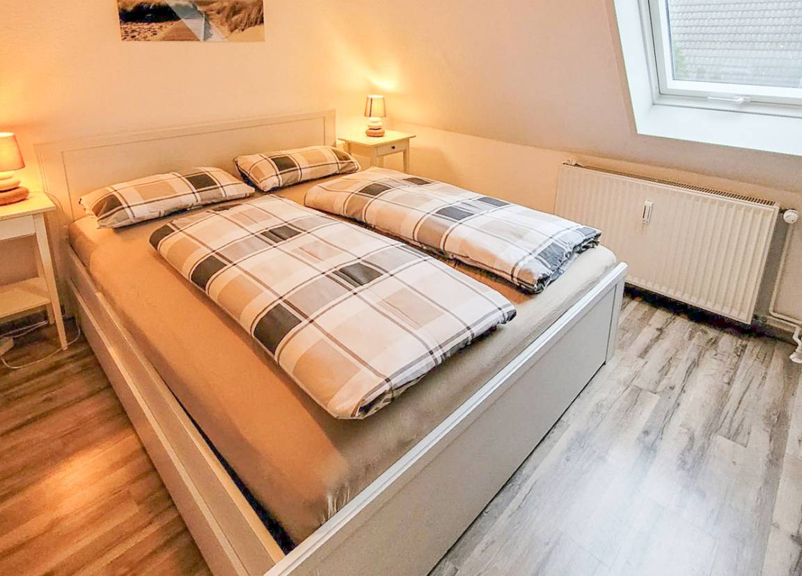 Für erholsame Nächte sorgt das separate Schlafzimmer. Das in elegantem Weiß gehaltene Doppelbett (1,60 m breit) ist mit neuen Lattenrosten und hochwertigen Matratzen ausgestattet – ideal, um nach einem langen Tag an der Seeluft in tiefe Träume zu sinken. Das Lederschlafsofa im Wohnzimmer bietet ausgeklappt eine weitere Schlaffläche (1,40 m breit). Ein modernes Badezimmer mit Dusche und WC rundet Ihr Wohlfühlpaket ab.