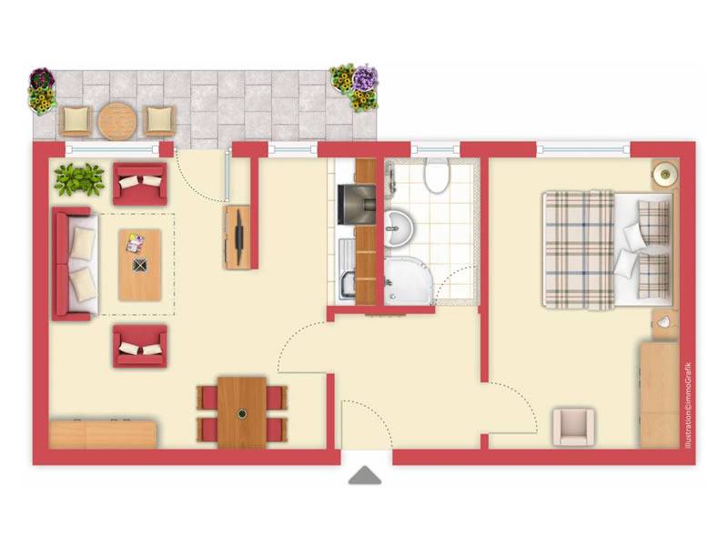 Die Wohnung Nr.17 liegt im Parterre und ist für 2-3 Personen eingerichtet. Sie haben einen Wohnschlafraum mit Schlafsofa, einen Schlafraum, Küche, Dusche/WC, Flur und Terrassen.