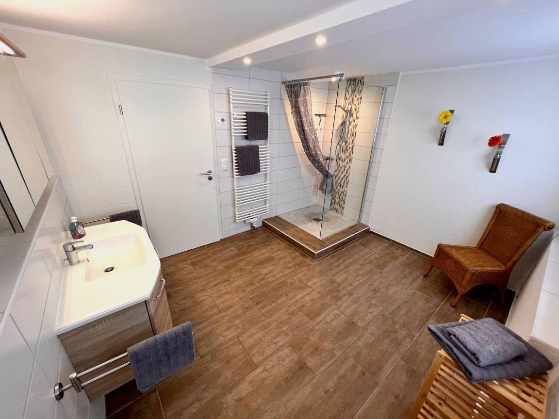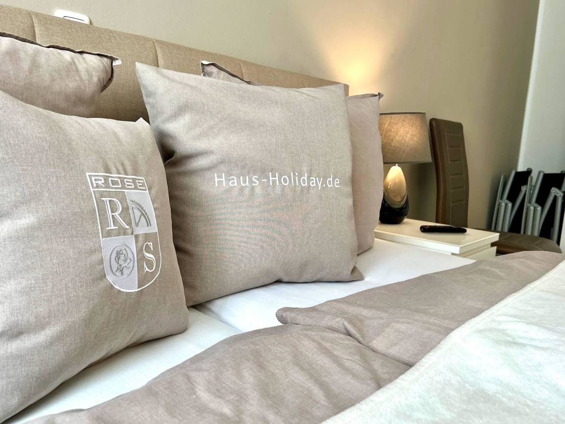 Die Ferienwohnung "Holiday 5" bietet auf 84 m² Wohnfläche im Tiefparterre Platz für bis zu 4 Personen. Der Eingangsbereich ist mit einer Garderobe ausgestattet. Das Wohn- und Esszimmer umfasst eine integrierte, voll ausgestattete Küche mit Geschirrspüler und Backofen. Es gibt ein Schlafzimmer mit Doppelbett und Kleiderschrank sowie ein weiteres Schlafzimmer mit zwei Einzelbetten, Kleiderschrank und Schreibtisch. Ein großes, Tageslicht-badezimmer bietet Dusche, WC und Fußbodenheizung. Die mit Bestuhlung und Liegen ausgestattete Terrasse lädt zum Verweilen ein. Ein PKW-Stellplatz und WLAN sind inklusive. Im Keller stehen eine Waschmaschine, Bügelbrett und Bügeleisen zur gemeinschaftlichen Nutzung bereit. Haustiere sind willkommen, während das Haus eine Nichtraucherumgebung ist.