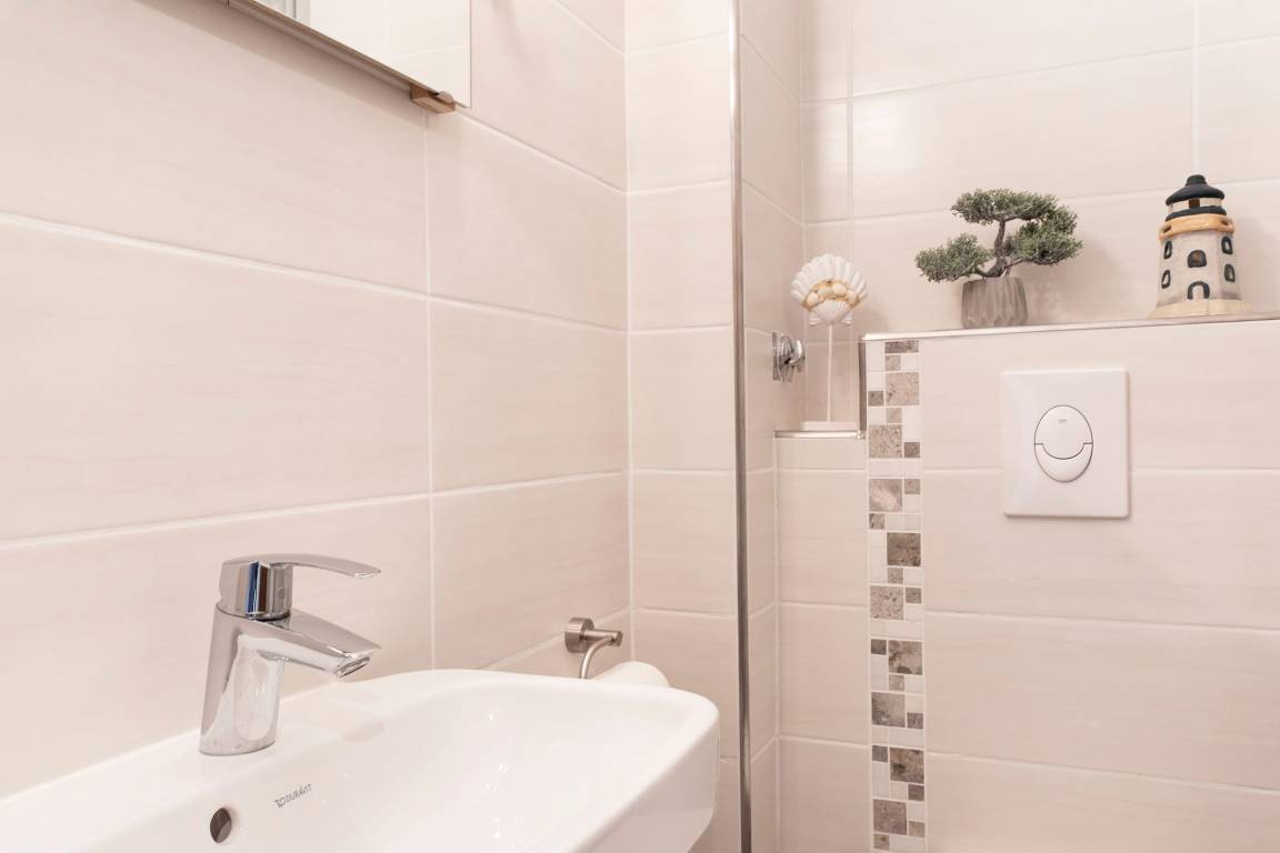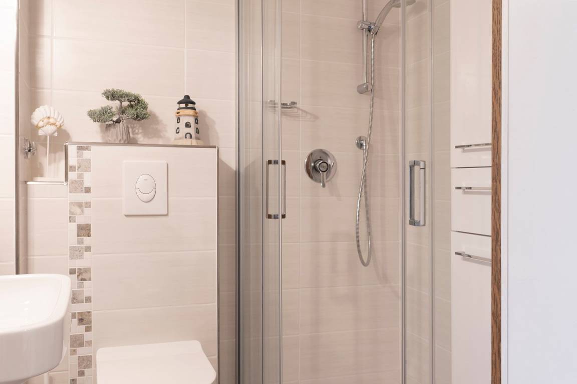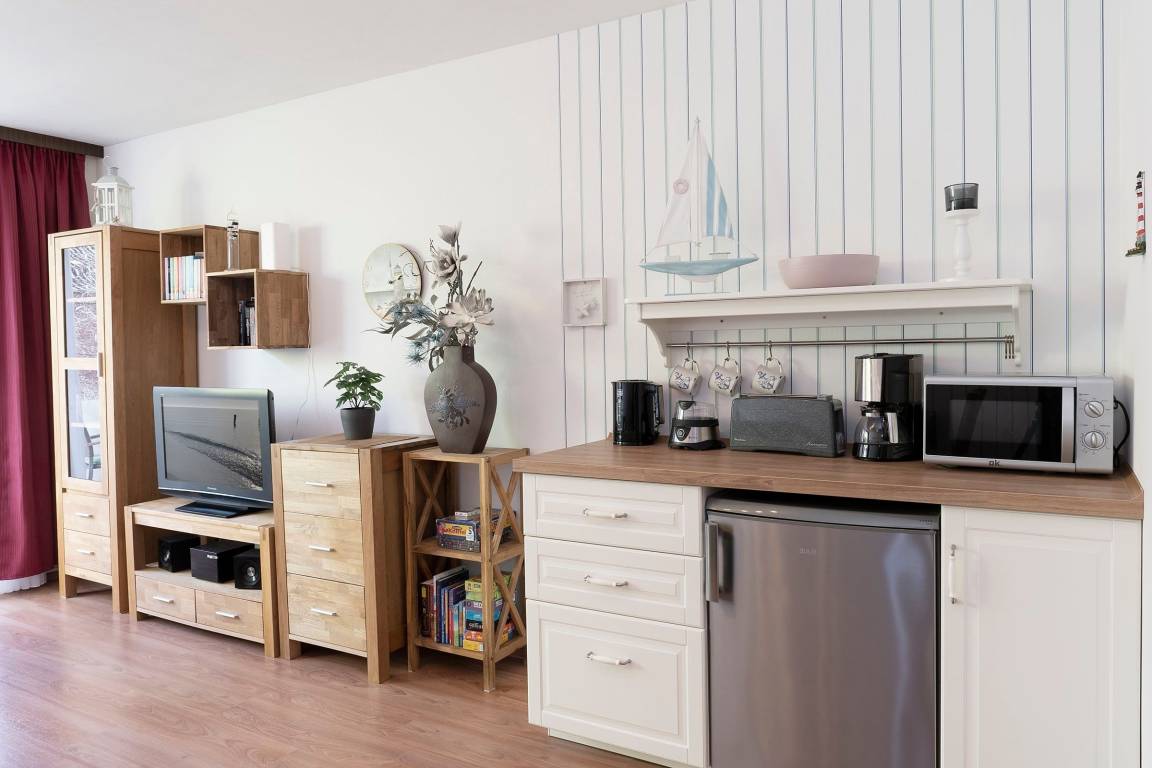 Der moderne Wohnbereich überzeugt mit gemütlicher Couch, die bei Bedarf in einen weiteren Schlafplatz (2x 90x200 cm) für 2 Personen verwandelt werden kann und der Flachbild-Fernseher sorgt auch an Regentagen für ausreichend Unterhaltung. Von hier aus haben Sie Zugang auf den möblierten Balkon, auf dem Sie die herrlich salzige Ostseeluft schnuppern können. Dank der offenen Küchenzeile können Sie sich im Urlaub problemlos selbst verpflegen und haben am Esstisch ausreichend Platz die schmackhaften Köstlichkeiten gemeinsam zu genießen. Im separaten Schlafzimmer mit Kleiderschrank lädt ein bequemes Doppelbett (2x 90x200 cm) zum Träumen ein. Das Duschbad rundet die Ausstattung dieser Ferienwohnung ab.
