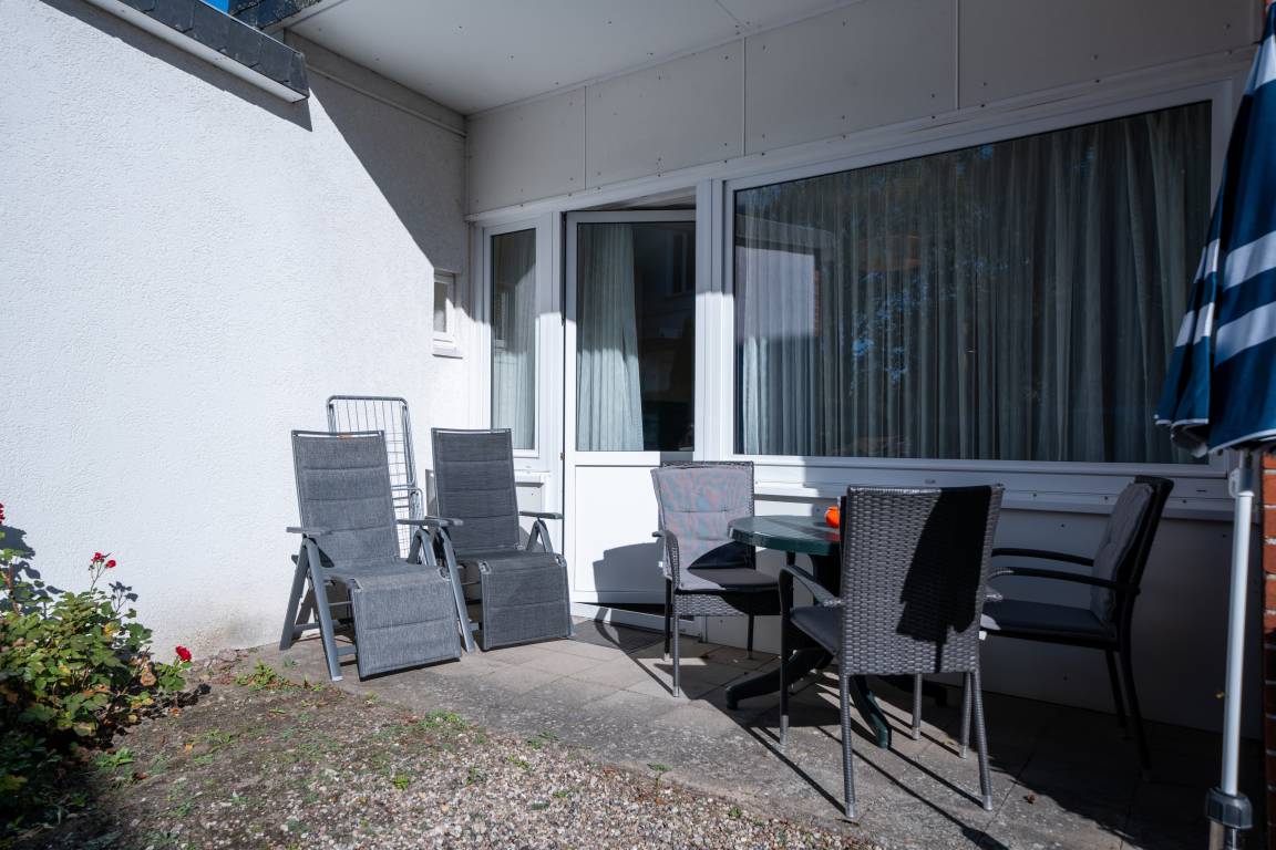 Die an den Wohnbereich angrenzende Terrasse ist mit Gartentisch, Bestuhlung und Sonnenschirm ausgestattet.