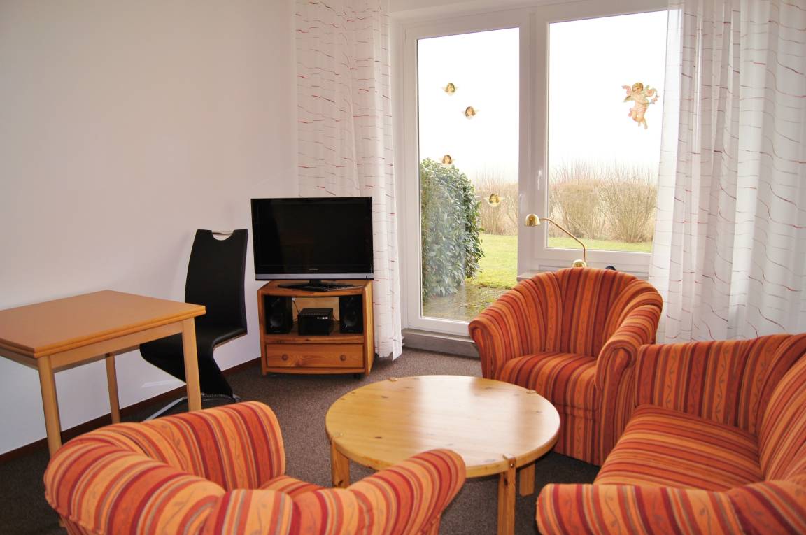Vom Eingangsbereich aus, erreichen Sie das separate Schlafzimmer mit Doppelbett, das separate Duschbad mit WC und den Wohnbereich mit offener Küche und Essbereich. Das große Terrassenelement ermöglicht viel Lichteinfall und auf der Terrsasse lässt sich die Nachmittagssonne voll geniessen. Auf der Terasse befindet sich ein Original Dahmer Strandkorb. Im Wohnbereich befindet sich eine Sitzgruppe mit Sessel und einem Sofa, ein Tisch mit 2 Stühlen steht Ihnen zum Essen zur Verfügung.