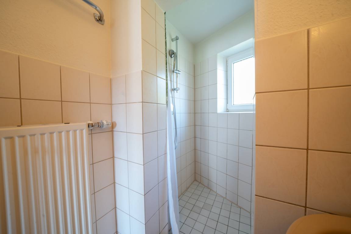 Das Badezimmer ist mit Dusche und WC ausgestattet.