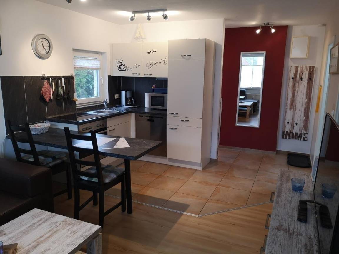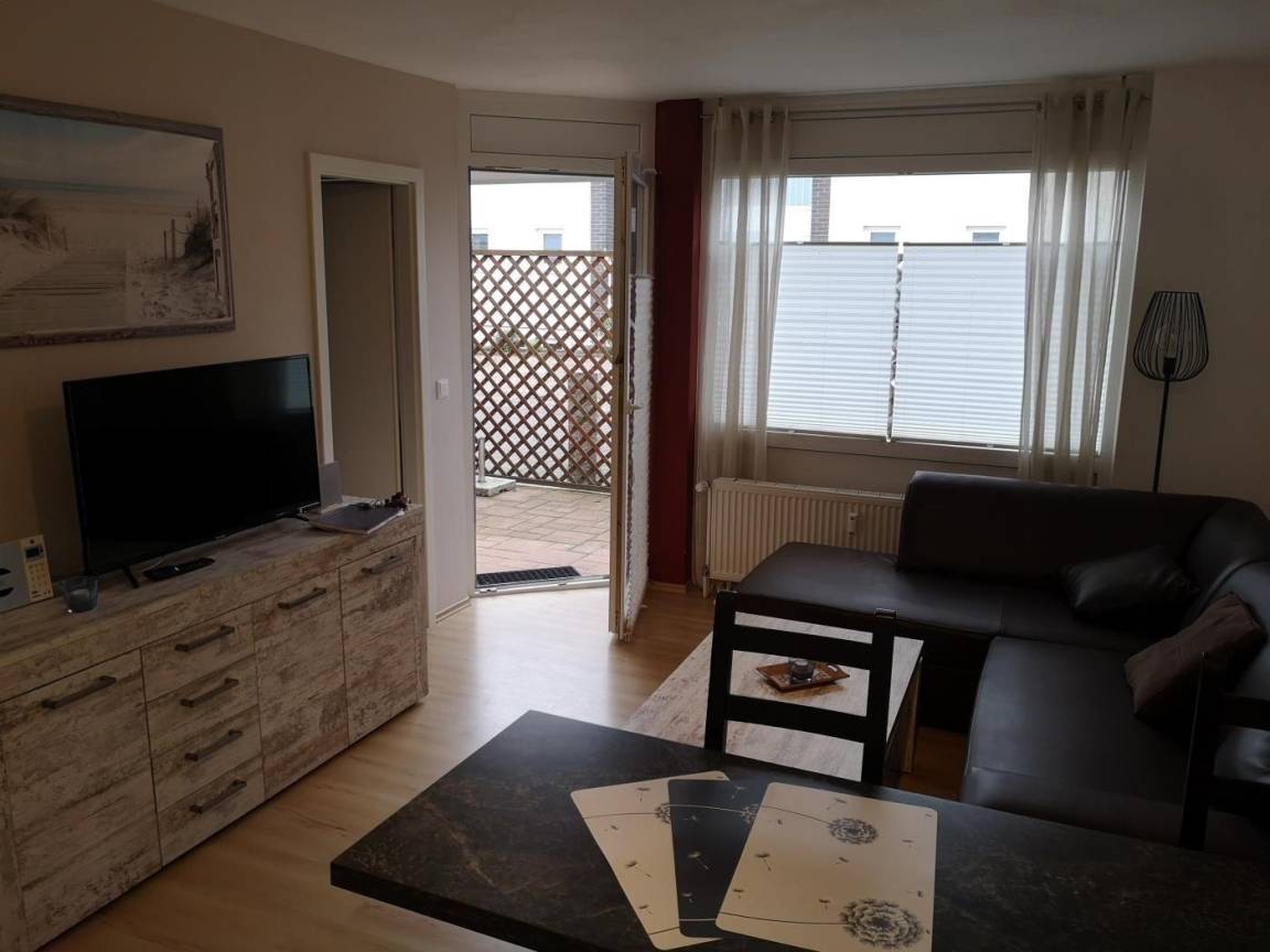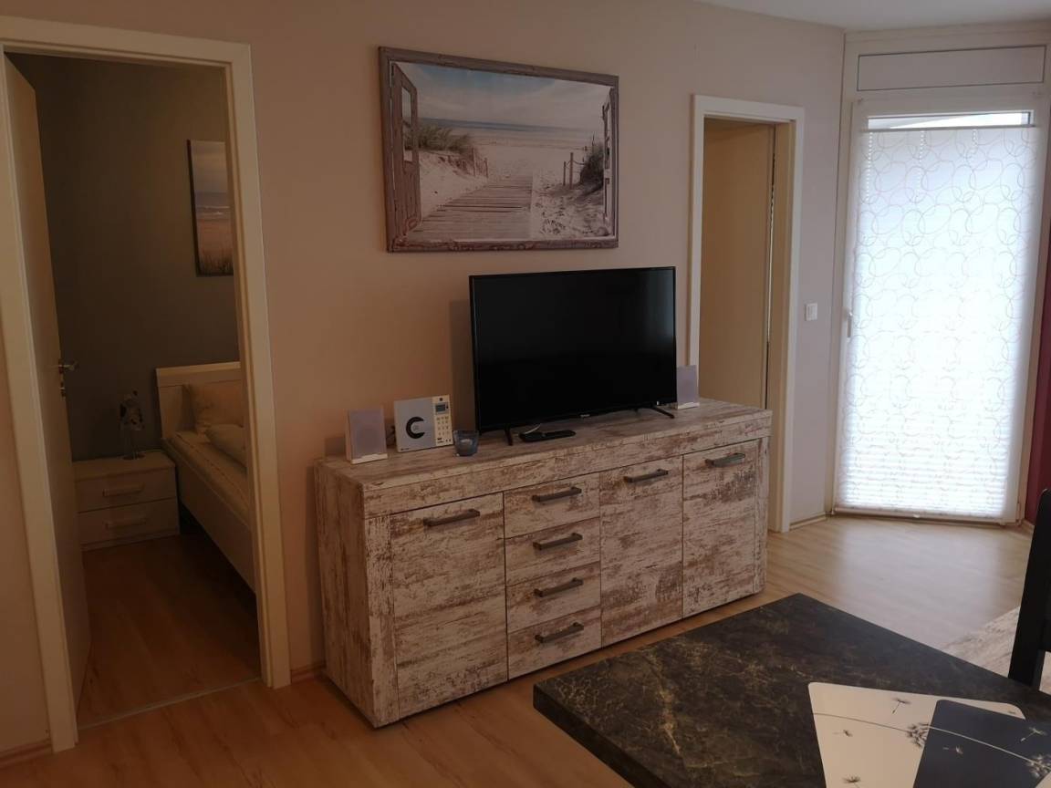 Die Ferienwohnung bietet einen angenehmen Rückzugsort mit einem hellen Wohnbereich, der mit modernen Möbeln und einem komfortablen Sofa ausgestattet ist. Die angrenzende offene Küche verfügt über hochwertige Geräte, darunter einen Herd, einen Kühlschrank und eine Mikrowelle, die zur Zubereitung von Mahlzeiten einladen. Der gemütliche Essbereich ergänzt den Raum.
