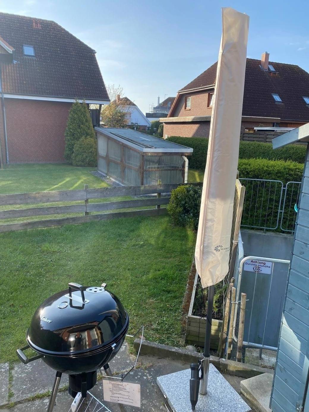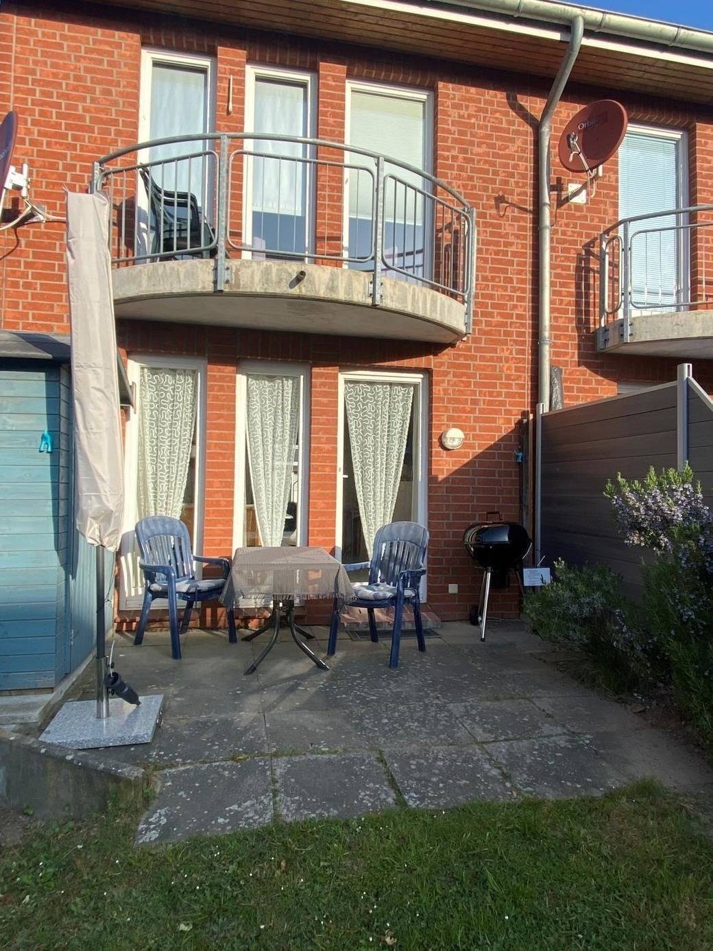 Der Außenbereich des Reihenendhauses in der Langen Wiese 8 bietet eine einladende Terrasse mit einem kleinen, eingezäunten Garten, ideal für entspannte Stunden im Freien. Die zur Verfügung stehende Terrasse ist mit einem Kugelgrill ausgestattet, was für gesellige Grillabende sorgt. Der Strand ist lediglich ca. 400 Meter entfernt, wodurch die Gäste die Möglichkeit haben, schnell und unkompliziert die Küste zu erreichen. Der Außenbereich ist somit perfekt für Erholungssuchende und Familien geeignet, die die Natur und die frische Luft genießen möchten. Das Grundstück ermöglicht eine private Atmosphäre, während die Nähe zum Strand zusätzliche Freizeitaktivitäten und Erkundungen bietet.