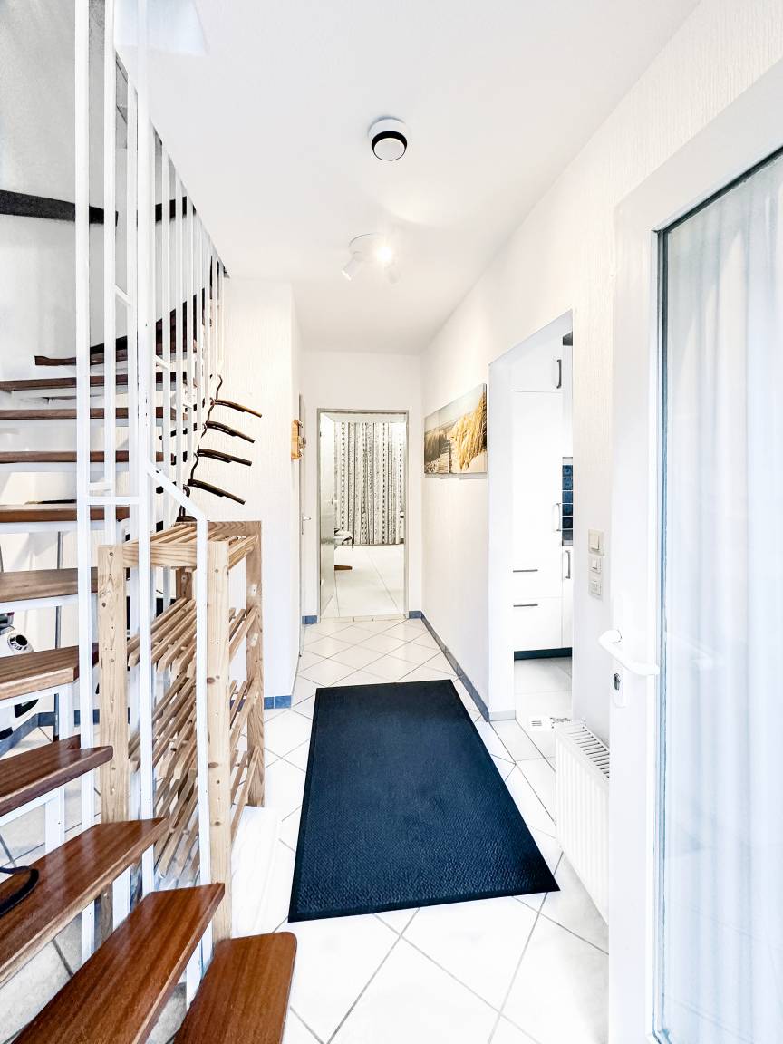 Erdgeschoss: Flurbereich mit Garderobe, Gäste-Wc, gemütliches Wohnzimmer mit direktem Zugang zur Terrasse sowie die sep. Küche mit Kühl/Gefrierkombi, Herd, Backofen, Kühlschrank, Kaffeemaschine, diverses mehr und Waschmaschine.