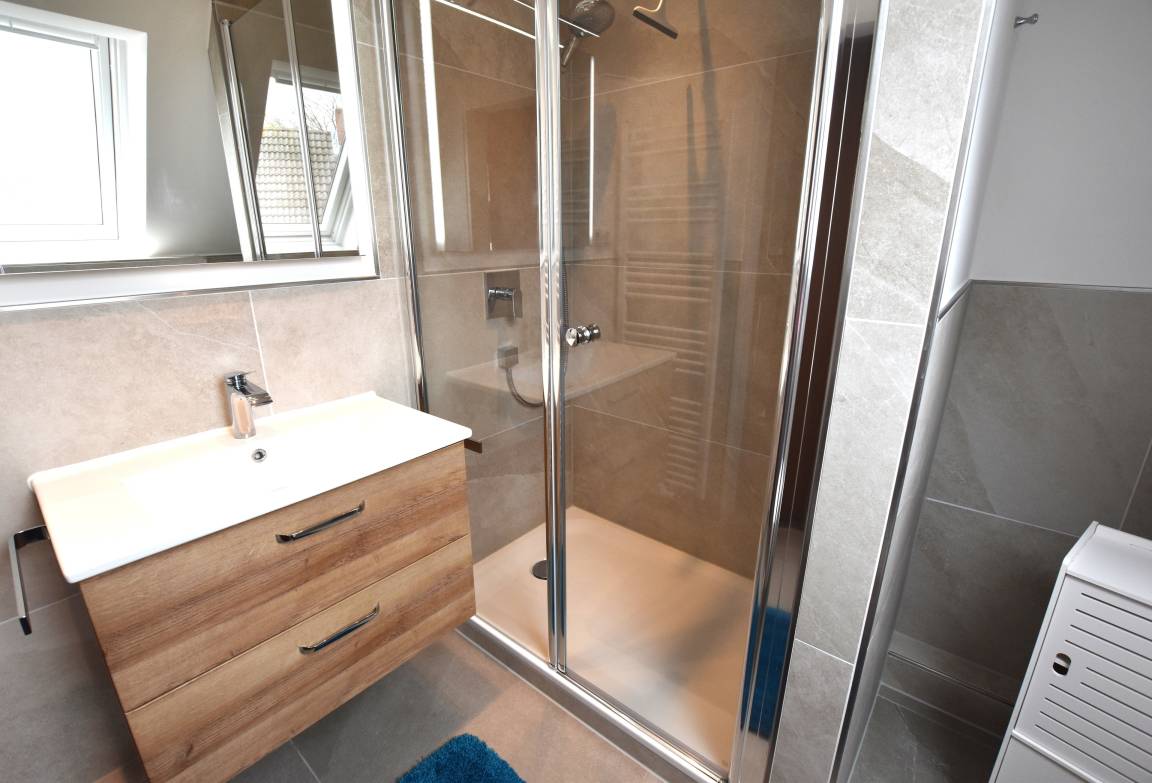 1.Obergeschoss: Flur, Schlafzimmer mit Doppelbett ( 2 x 90x200 cm), TV und Zugang zum Balkon mit Markise, modernes Duschbad.