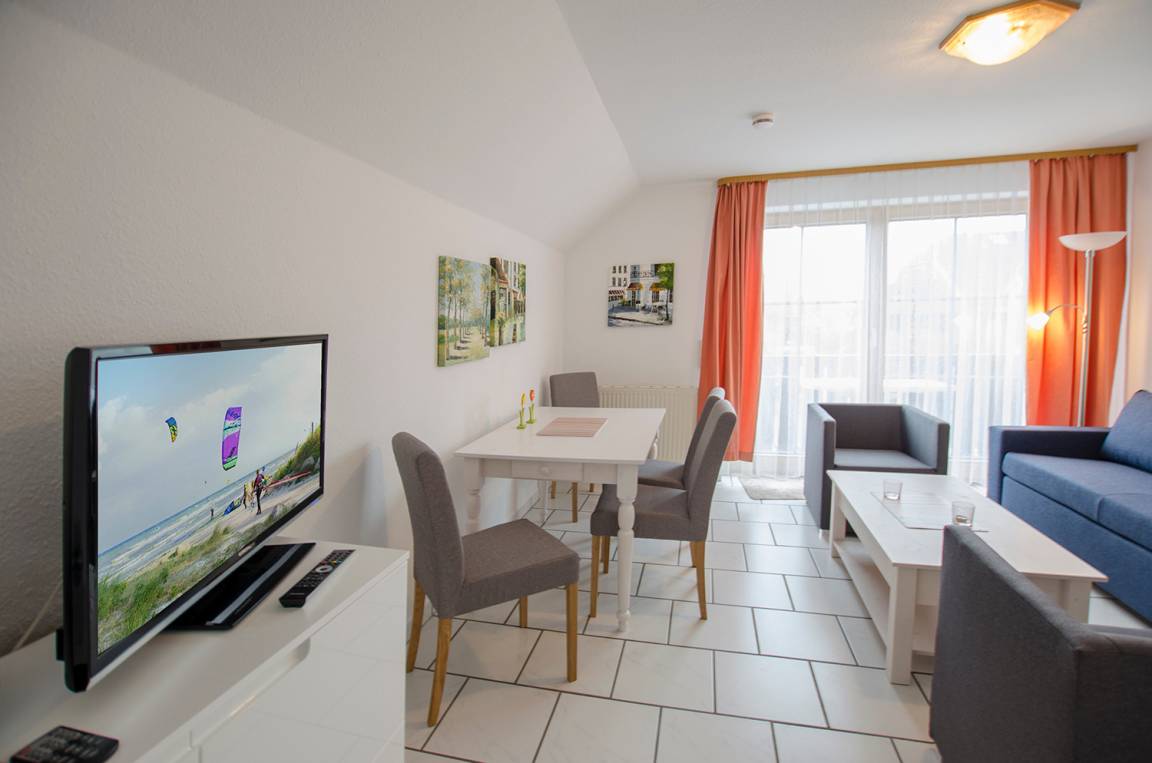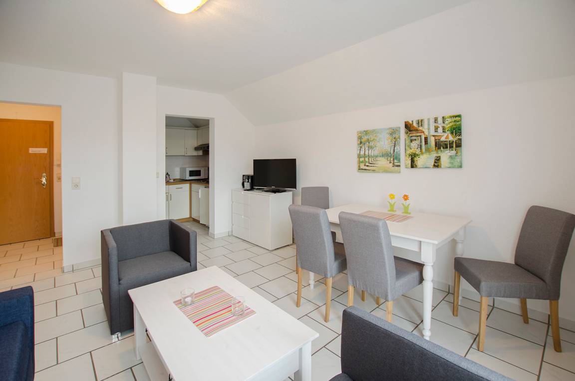 Die Ferienwohnung verfügt über einen Wohnschlafraum mit Schlafcouch, ein neuer Blueray-DVD-Player mit App-Zugang von Netflix, Youtube und Amazon bei vorhandener Internetverbindung. Mit zwei Sesseln mit Kissen, einem Couchtisch, einem Esstisch mit vier Stühlen und mit einer integrierten Küche.