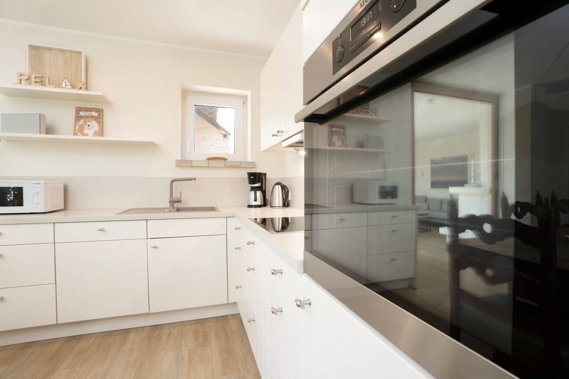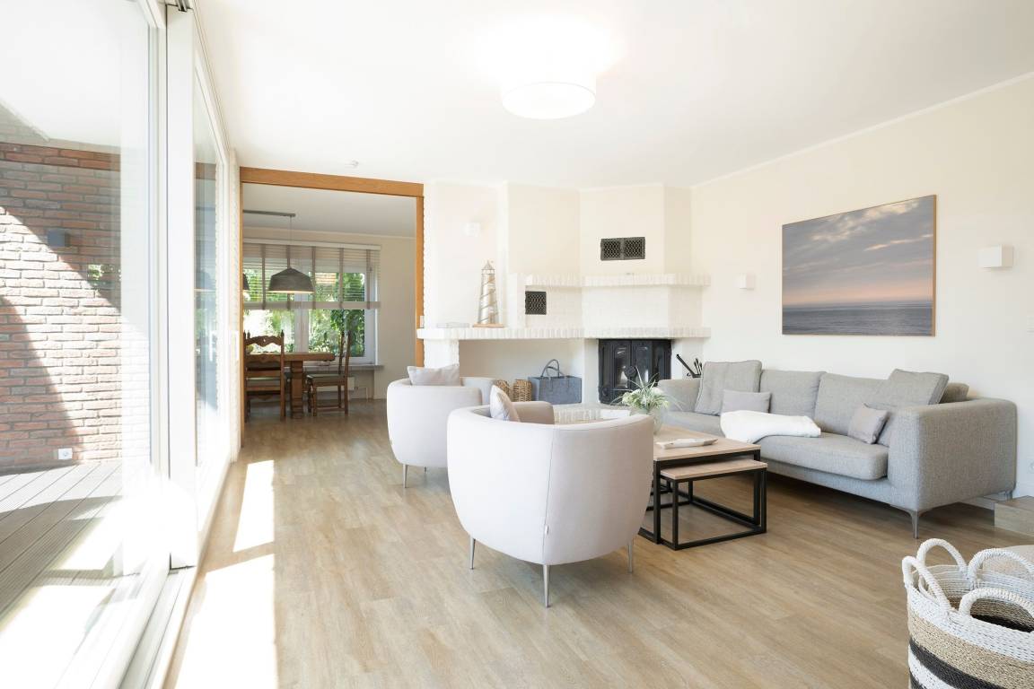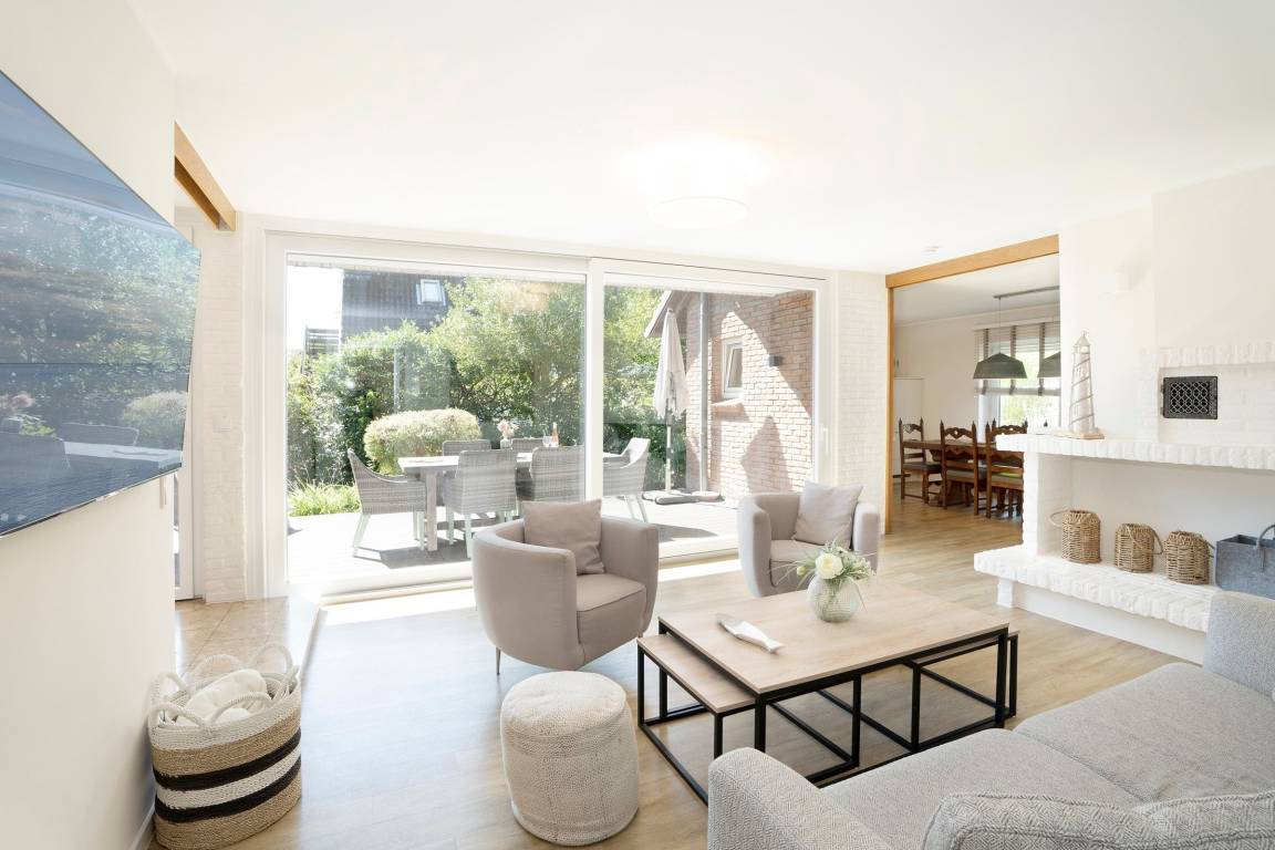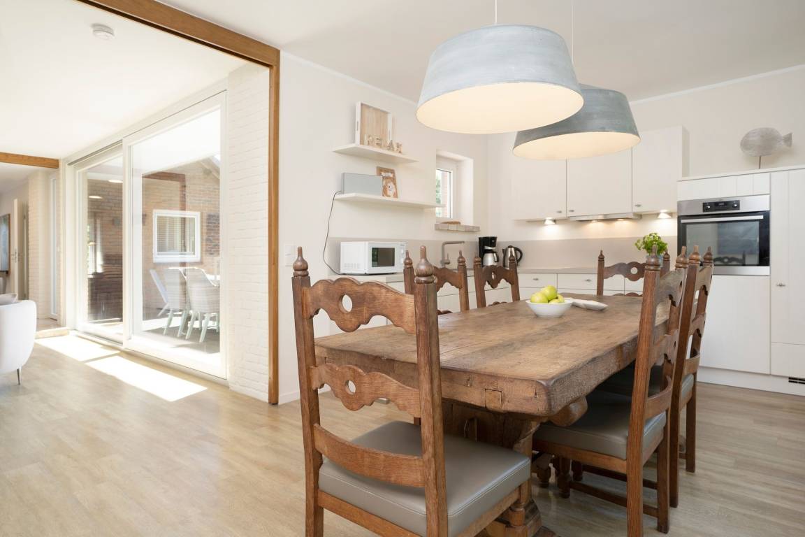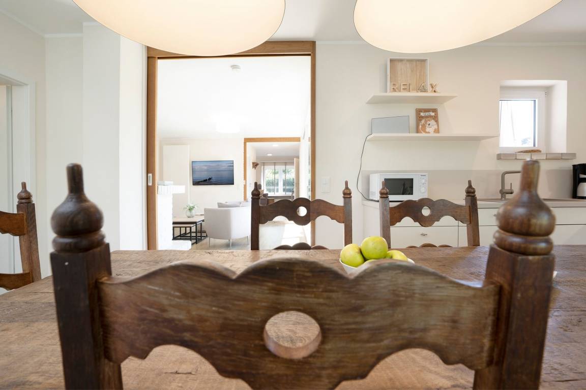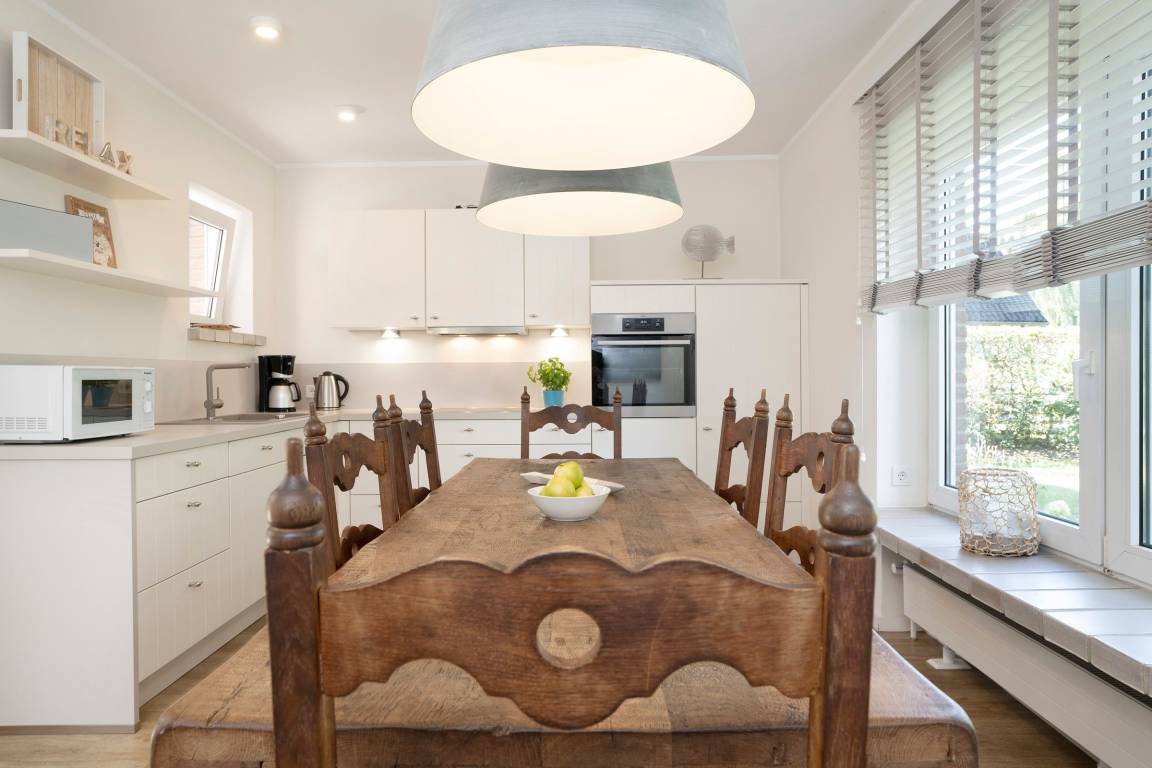 Der helle, unheimlich charmante Wohnraum mit Kamin und Flatscreen-TV geht über in die großzügige Wohnküche, die mit vielen technischen Raffinessen versehen wurde. An dem eindrucksvollen, markanten Holztisch werden Sie viele gesellige Urlaubsstunden verbringen. Die wunderschöne, vom Garten eingerahmte Terrasse, wartet ebenfalls darauf, Sie mit viel Sonne und unserer frischen Ostseeluft überzeugen zu können. Sitzgelegenheiten und Sonnenliegen stehen für Sie bereit, ein Sonnenschirm spendet bei Bedarf Schatten.