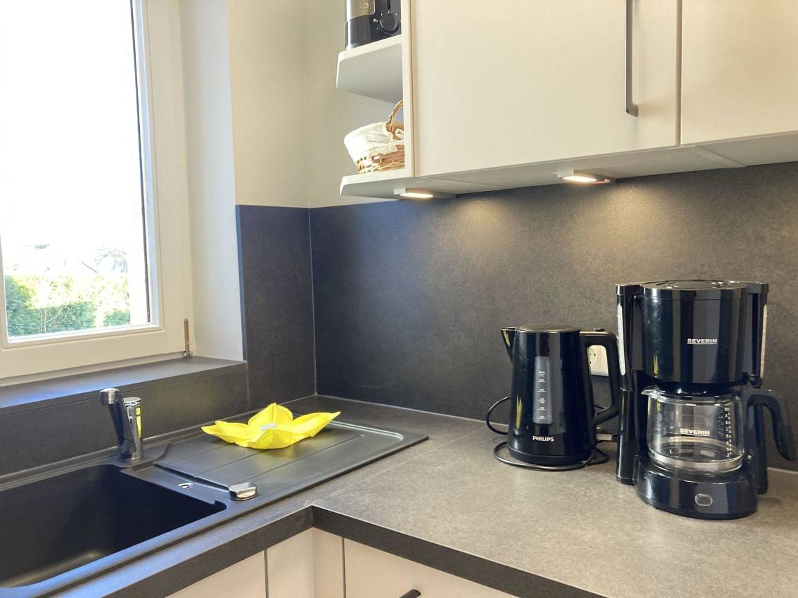 Die Ferienwohnung "Sanfte Welle" im Lindenhof bietet auf 45 m² modernen Komfort für bis zu drei Erwachsene und ein Kind. Im Hochparterre befindet sich ein einladender Eingangsbereich mit Garderobe. Das Wohnzimmer ist mit einer Schlafcouch (1,40 x 1,90 m), einem Ohrensessel, einem Fernseher und einem Essplatz für vier Personen ausgestattet. Zudem ist die Küche vom Wohnzimmer räumlich abgetrennt. Ein Schlafzimmer mit Doppelbett (2 Matratzen á 90 x 200 cm) und Kleiderschrank sorgt für erholsame Nächte. Das Badezimmer verfügt über eine Dusche und ein WC. Der große Balkon (18 m²) in Süd- und Ostlage lädt zum Entspannen ein. Gemeinschaftlich genutzte Waschmaschine und Trockner im Keller stehen gegen Gebühr zur Verfügung. Ein Pkw-Stellplatz mit E-Ladesäule ist vorhanden. Hunde sind willkommen.