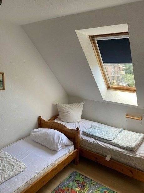 Das Reihenhaus verfügt über zwei Schlafzimmer; eines ist mit einem Doppelbett ausgestattet, während das zweite Schlafzimmer zwei Einzelbetten bietet. Die Räumlichkeiten sind durch eine Dusche und ein separates WC ergänzt, die für zusätzlichen Komfort sorgen.