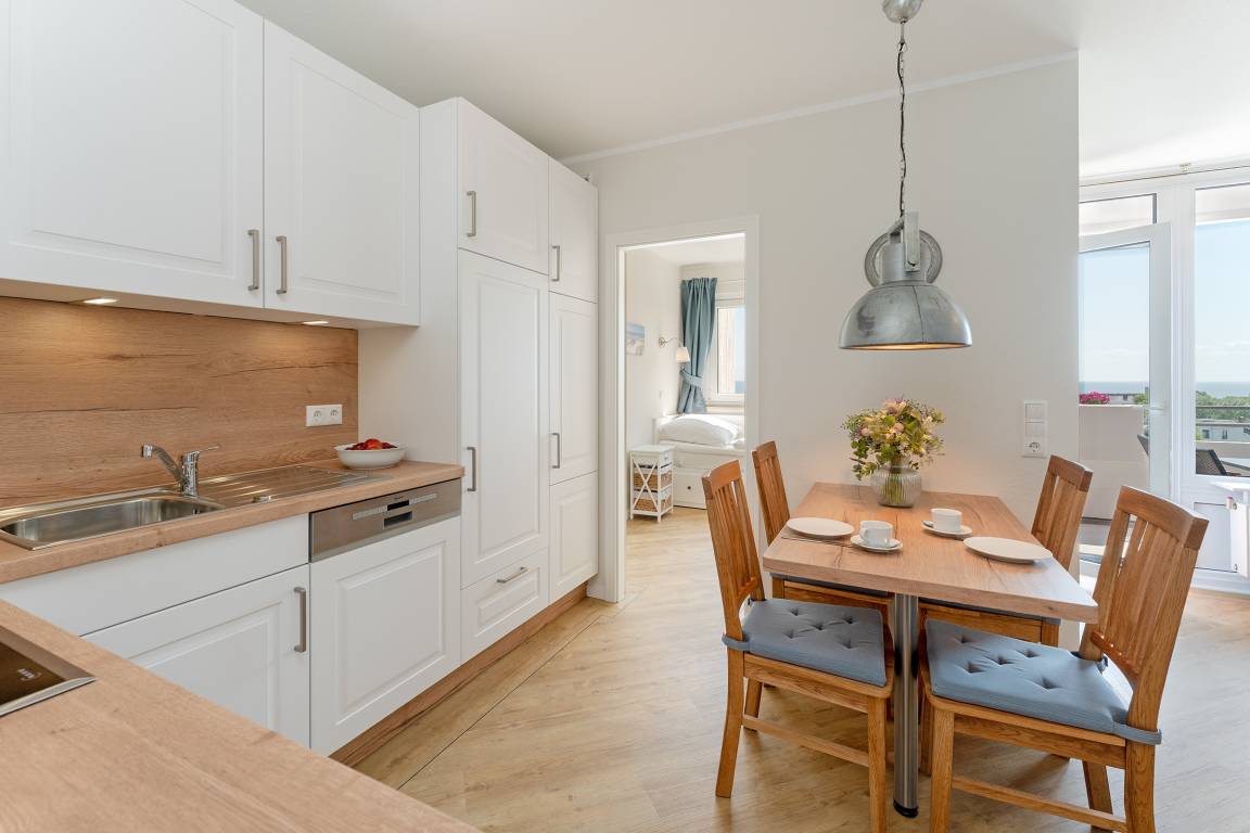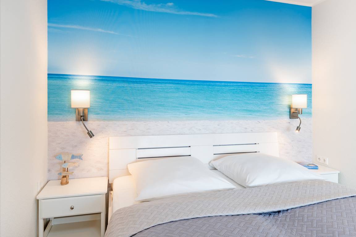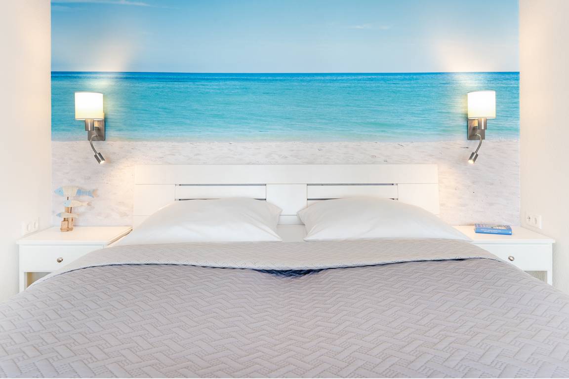 Die Ferienwohnung umfasst eine Wohnfläche von ca. 47m² , ist für bis zu 4 Personen geeignet und verfügt über einen großen Balkon. Der kombinierte Wohn-/Schlafbereich besticht durch geschmackvolles Ambiente. Das Elternbett (2x 90x200 cm) hat eine bequeme Komforthöhe. Das separate Schlafzimmer mit zusätzlichem Smart-TV bietet einen weiteren komfortablen Schlafplatz für bis zu 2 Personen im Kojenbett (je 80x200 cm). Auch von hier genießen Sie einen herrlichen Blick aufs Meer. Die große offene Küche ist sehr gut ausgestattet, ein Geschirrspüler erleichtert den Urlaubsalltag. Im Badezimmer setzt sich das moderne Design fort. Im Wohnzimmer verfügt der große Smart TV über viele Programme in HD-Qualität. Kostenloses, schnelles WLAN ist selbstverständlich.