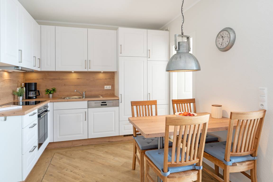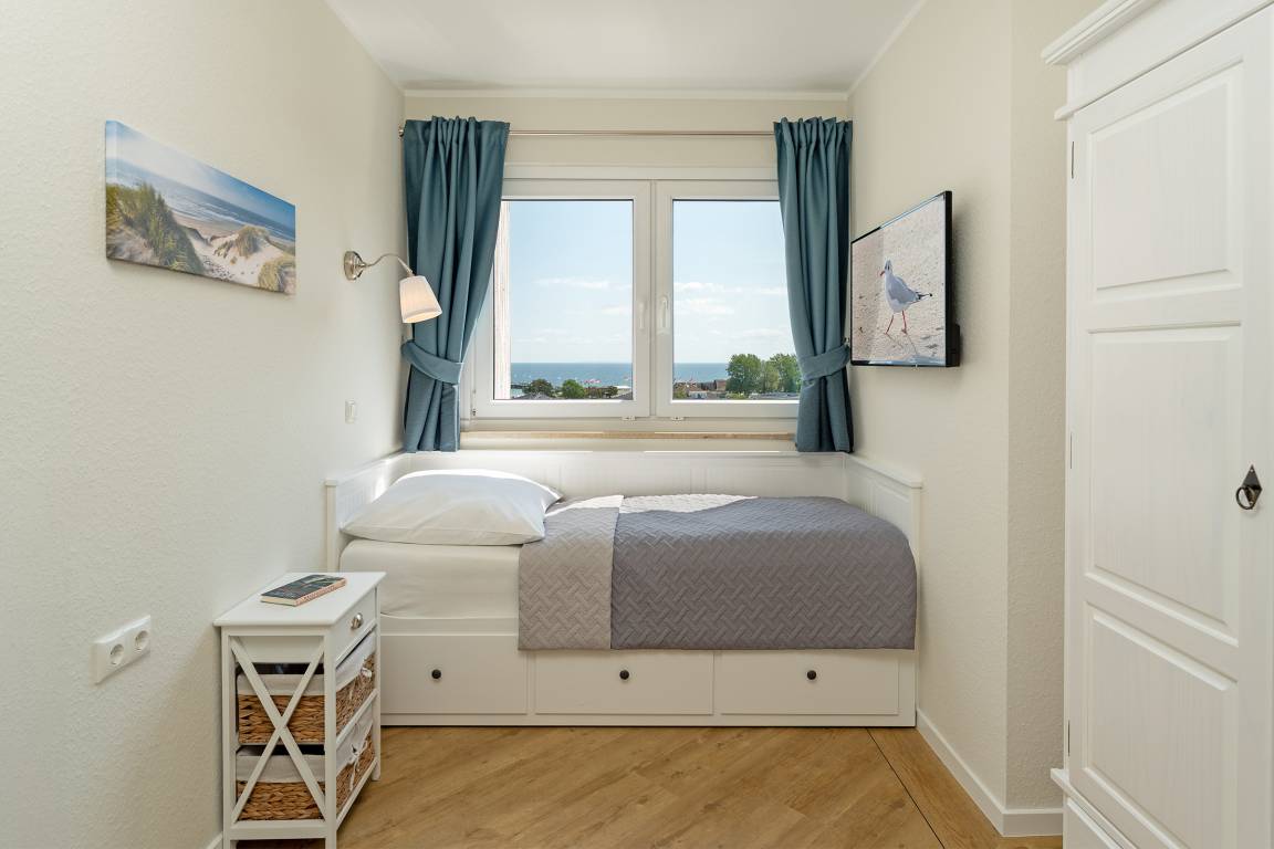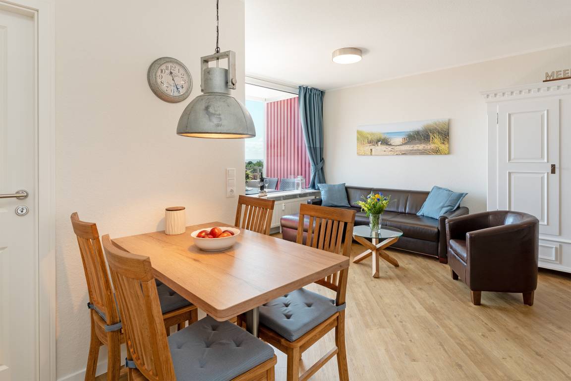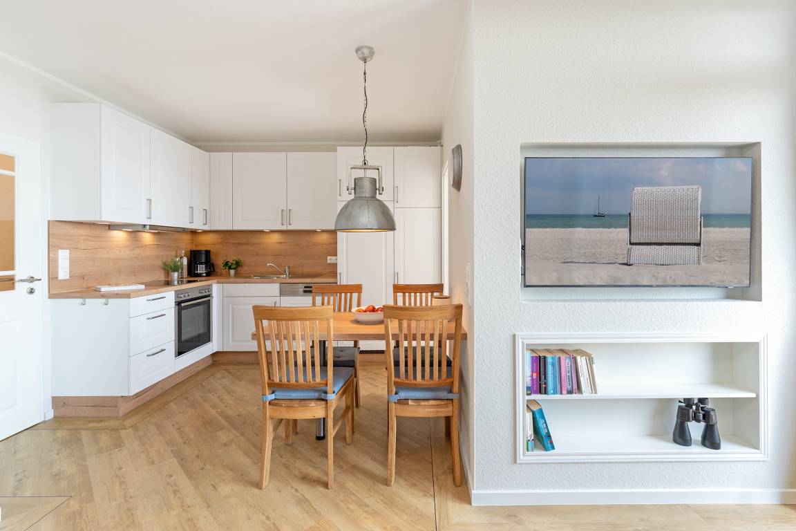 Die Ferienwohnung umfasst eine Wohnfläche von ca. 47m² , ist für bis zu 4 Personen geeignet und verfügt über einen großen Balkon. Der kombinierte Wohn-/Schlafbereich besticht durch geschmackvolles Ambiente. Das Elternbett (2x 90x200 cm) hat eine bequeme Komforthöhe. Das separate Schlafzimmer mit zusätzlichem Smart-TV bietet einen weiteren komfortablen Schlafplatz für bis zu 2 Personen im Kojenbett (je 80x200 cm). Auch von hier genießen Sie einen herrlichen Blick aufs Meer. Die große offene Küche ist sehr gut ausgestattet, ein Geschirrspüler erleichtert den Urlaubsalltag. Im Badezimmer setzt sich das moderne Design fort. Im Wohnzimmer verfügt der große Smart TV über viele Programme in HD-Qualität. Kostenloses, schnelles WLAN ist selbstverständlich.