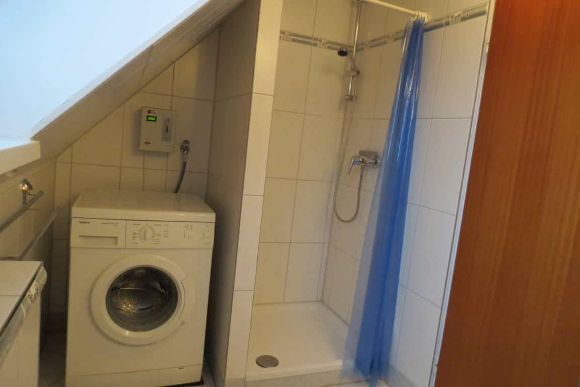 Es ist offen zu der Küchenzeile mit Geschirrspülmaschine, Mikrowelle, Cerankochfeld, Kühlschrank mit Gefrierfach, Kaffeemaschine, Wasserkocher, Toaster, Mixer, Eierkocher und Geschirr. Die Wohnung verfügt über ein Duschbad mit Dachfenster.
