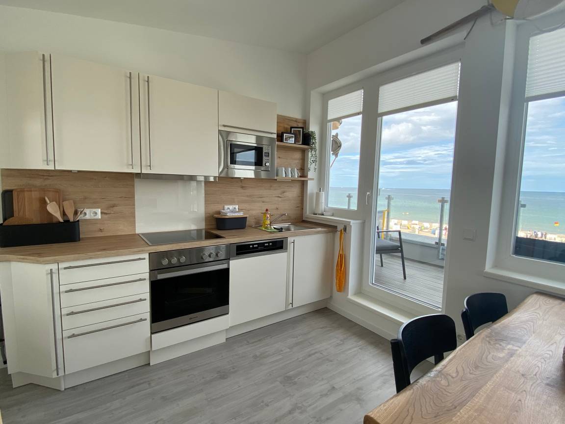 Im oberen Bereich erwartet Sie ein hell eingerichteter Wohnbereich mit großzügigem Essplatz und einer offen gestalteten Küche. Von hier aus haben Sie direkten Zugang zu Ihrem Balkon mit einmaligem Meerblick.