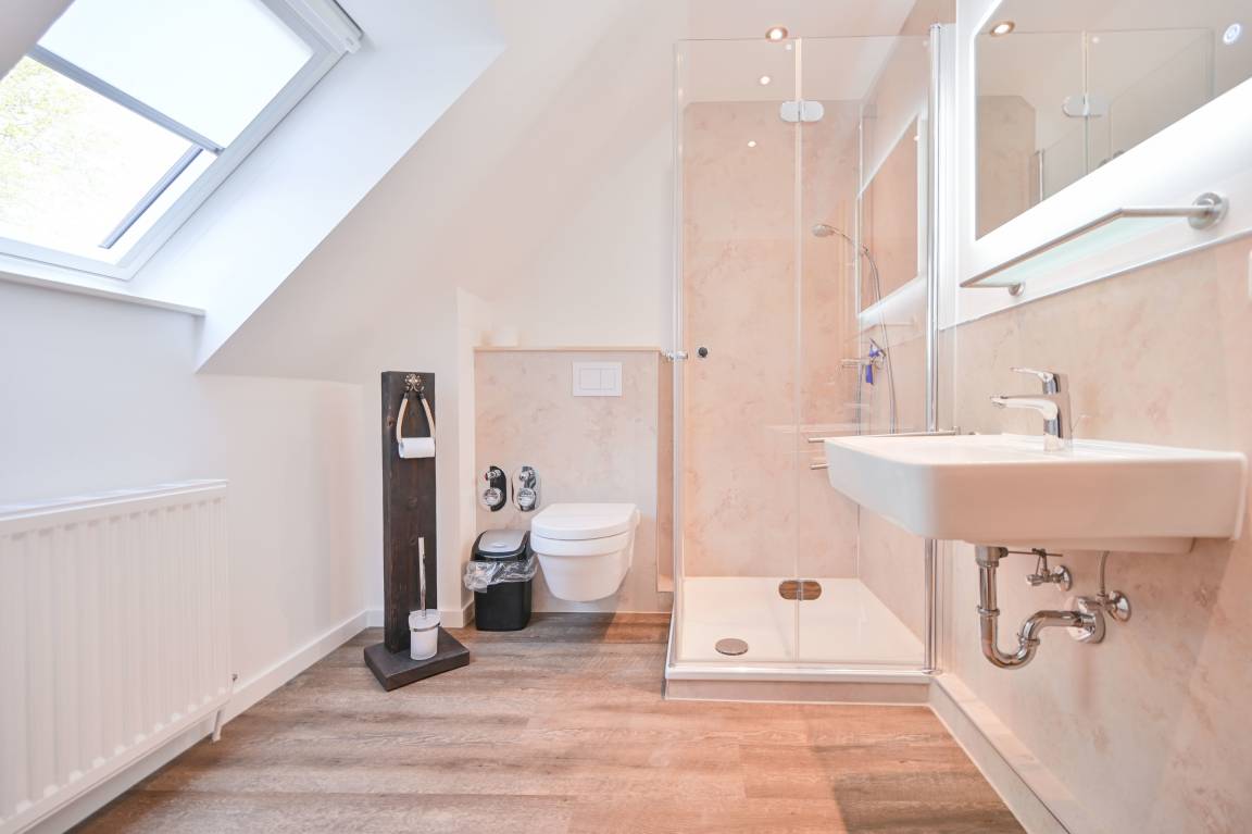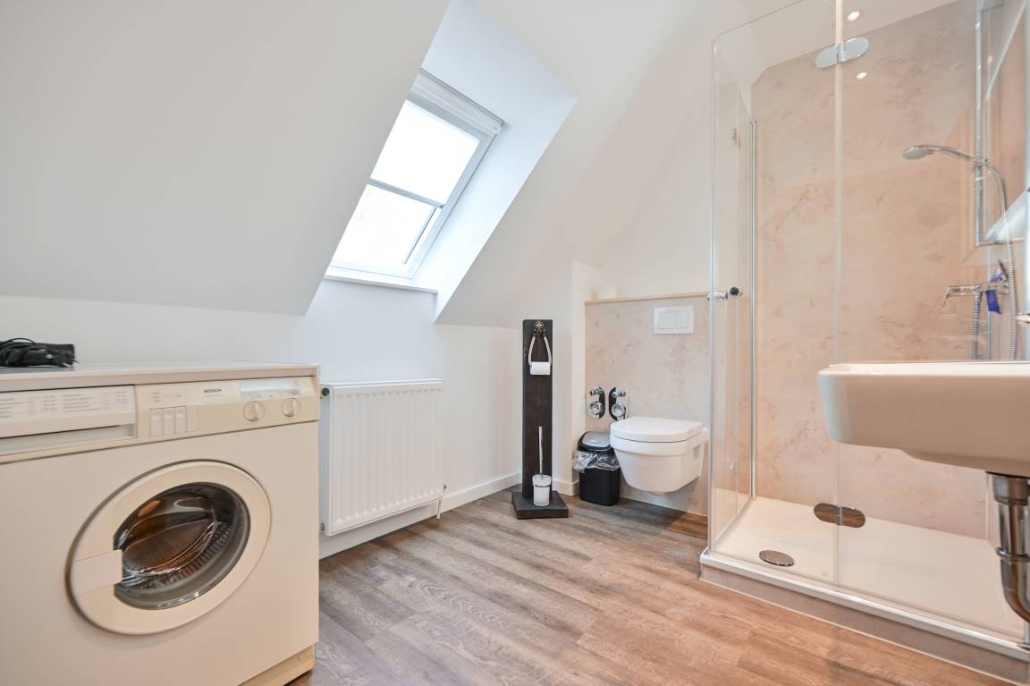 Das Badezimmer ist mit WC, Dusche und Waschmaschine ausgestattet.