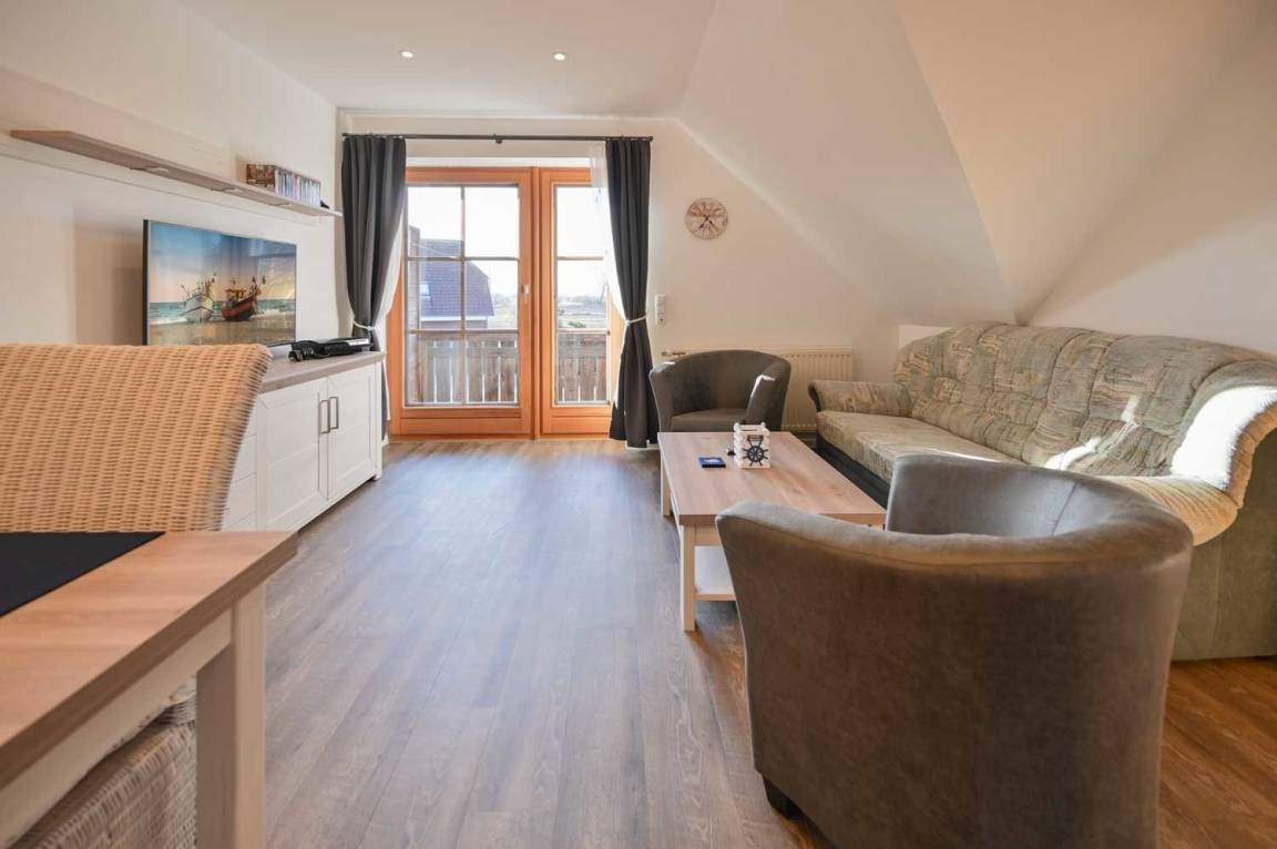 Das Wohnzimmer ist mit einem Sofa, zwei Sessel, Couchtisch, Kommode mit Flachbild-TV sowie einem Esstisch mit 4 Stühlen ausgestattet.
