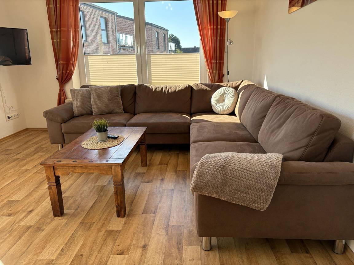 Die Ferienwohnung "Seelöwe" im Haus Meeresglück bietet auf 90 m² ausreichend Platz für bis zu 6 Erwachsene und ein Kleinkind. Die lichtdurchflutete Wohnung im 1. Obergeschoss verfügt über ein großzügiges Wohn- und Esszimmer mit integrierter, voll ausgestatteter Küche, inklusive Geschirrspüler und Backofen. Ein großer, möblierter Balkon ist direkt zugänglich. Es gibt drei Schlafzimmer: eines mit Doppelbett und Gitterbett, eines mit Doppelbett und TV sowie eines mit zwei Einzelbetten. Zwei Badezimmer, jeweils mit Dusche, WC und Fenster, runden das Angebot ab. Im gemeinsamen Keller befinden sich eine Waschmaschine und ein Trockner gegen Gebühr. Zwei PKW-Stellplätze sind direkt am Haus vorhanden. Fahrräder können im Keller oder am Haus abgestellt werden. Haustiere sind willkommen.