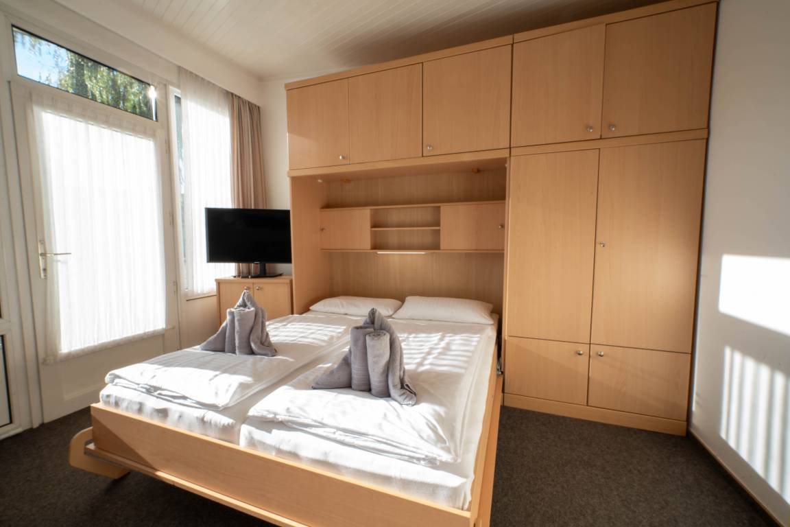 Der Bungalow verfügt über ein Schlafzimmer mit einem Einzelbett ( 90 x 200 cm ) und einem Wohnschlafraum mit Schrankbett (Schrankbett mit 2 Einzelmatratzen max. Belastungsgrenze pro Seite 125 kg).
