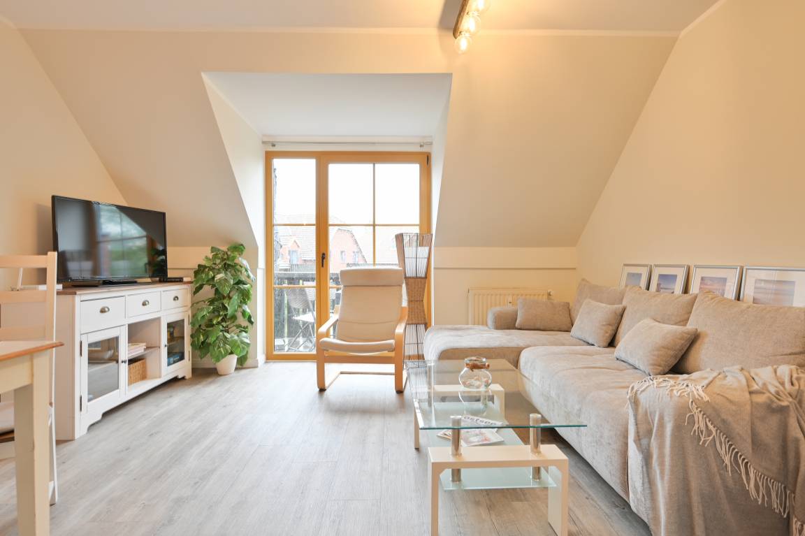 Sie erreichen die Wohnung im ersten Obergeschoss über den geräumigen und einladenden Flur mit Garderobe, Spiegel und großem Dielenschrank. Von hier aus gelangen Sie in den Wohn/Essbereich mit der schön ausgestatteten Küche, Esszimmermöbeln, dem Wohnbereich mit Schlafcouch für 1 Person, Sessel, Couchtisch, Stehlampe, großem Flachbildschirm, Radio/ Stereoanlage und direktem Zugang zum Balkon mit Möbeln.