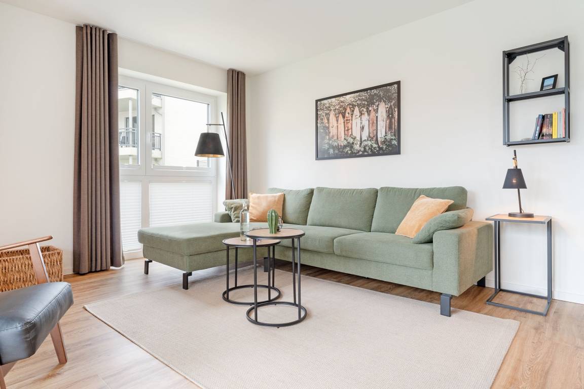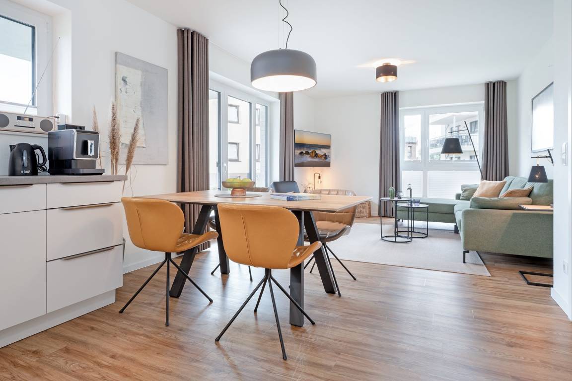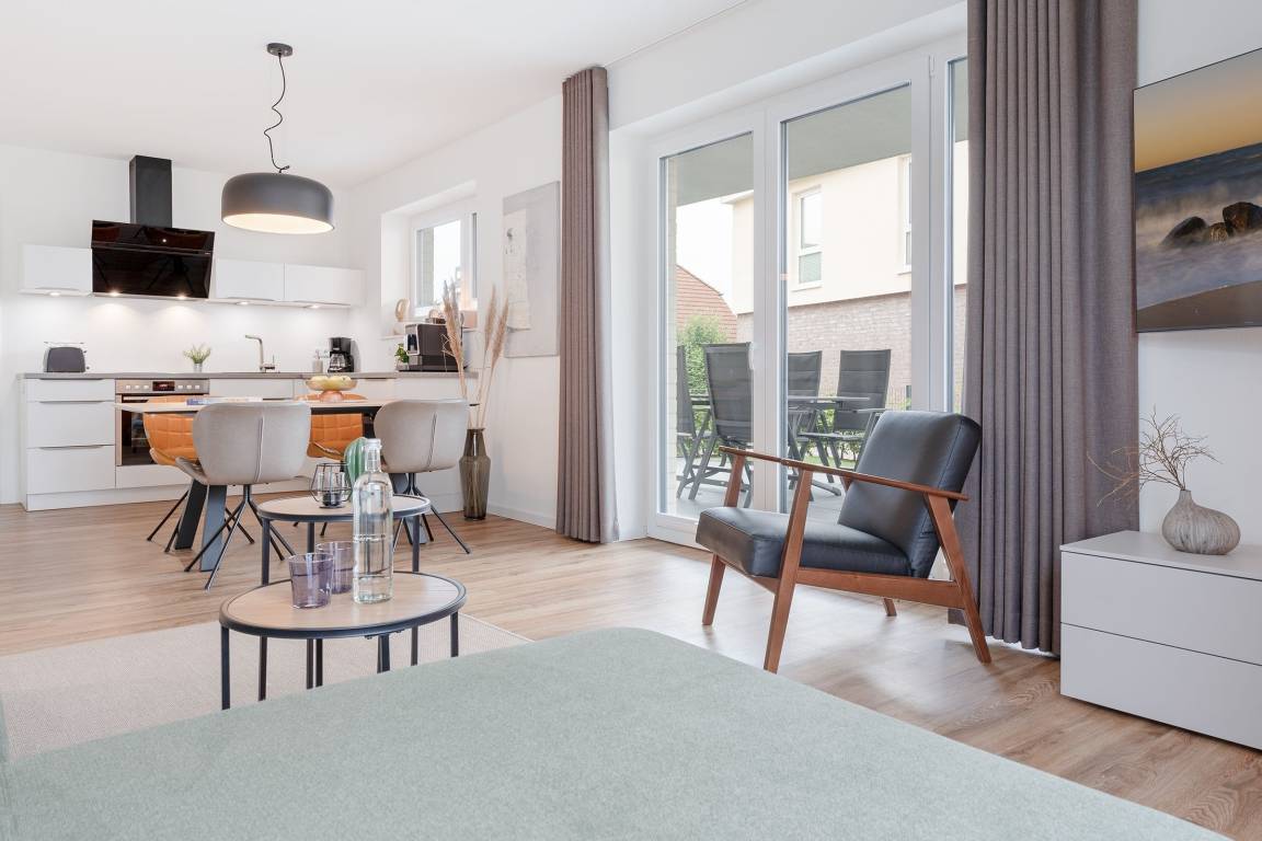 Mit viel Platz und Komfort präsentiert sich diese traumhafte Wohnung in der Wohnanlage Dahmer Dünen. Der lichtdurchflutete Wohn- und Essbereich ist liebevoll eingerichtet und bietet Ihnen mehrere Lieblingsplätze zum Entspannen. TV mit Magenta-HD-Sendern, CD-Spieler und Radio sorgen für Unterhaltung. Ein Highlight ist die großzügige, möblierte und überdachte Terrasse mit angrenzendem Gartenbereich zur Eigennutzung. Leckere Speisen können Sie in der offenen Küche zubereiten. Extras sind hier ein Kaffeevollautomat sowie ein Geschirrspüler. Auch die Nacht wird komfortabel: Beide Schlafzimmern sind jeweils mit einem Boxspringbett (180x200 cm bzw. 2x 90x200 cm) sowie Smart-TV ausgestattet. In dem einen Schlafzimmer lässt sich das Doppelbett wahlweise zu zwei getrennten Betten auseinanderziehen, in dem anderen Schlafzimmer befindet sich ein kleiner Arbeitsplatz. Das tageslichthelle Bad punktet mit einer bodengleichen Wellnessdusche und einer eigenen Sauna. Zudem gibt es ein Gäste-WC. Die gesamte Wohnung verfügt über eine Fußbodenheizung.