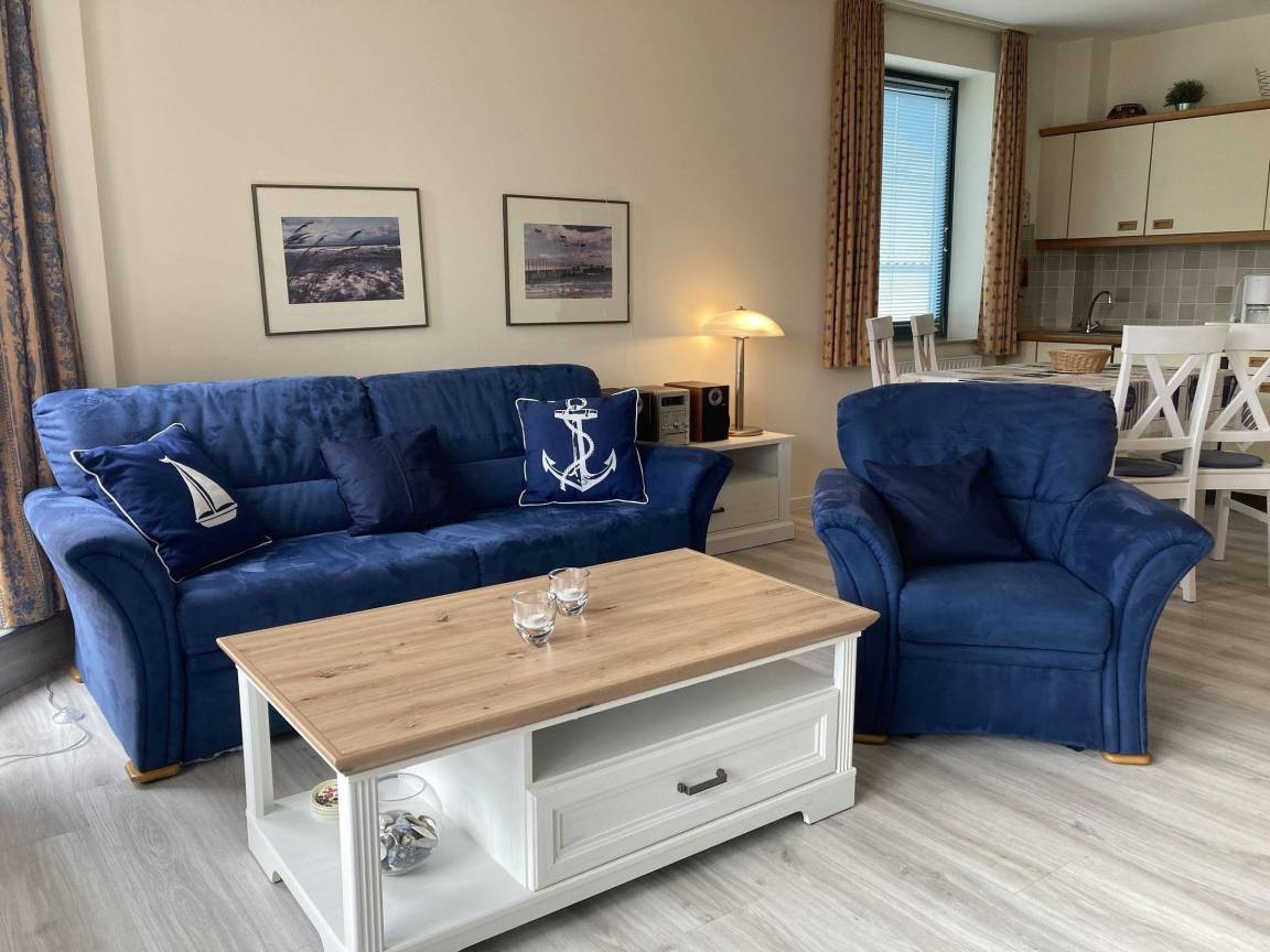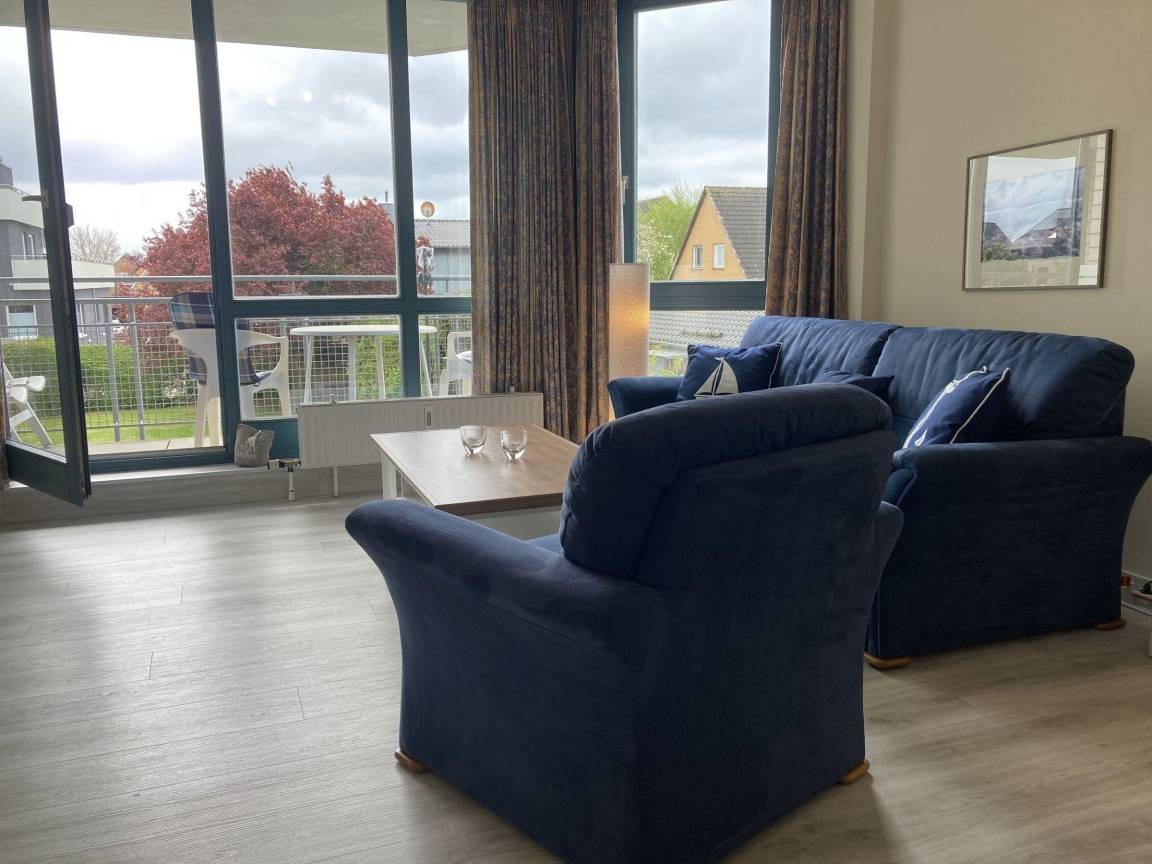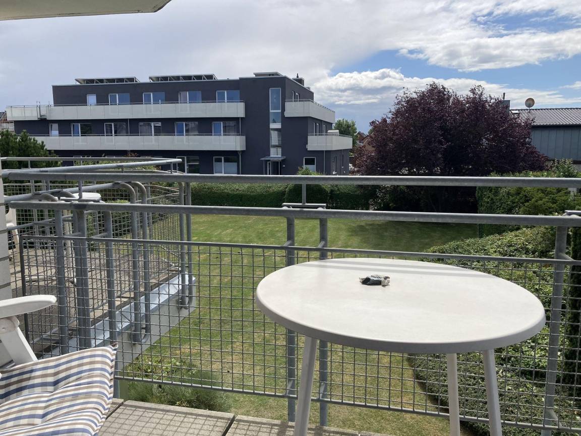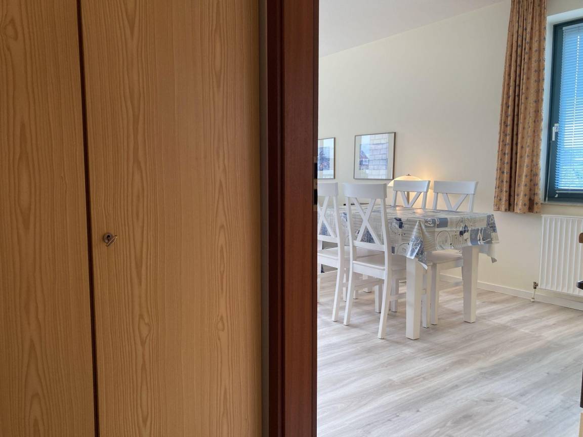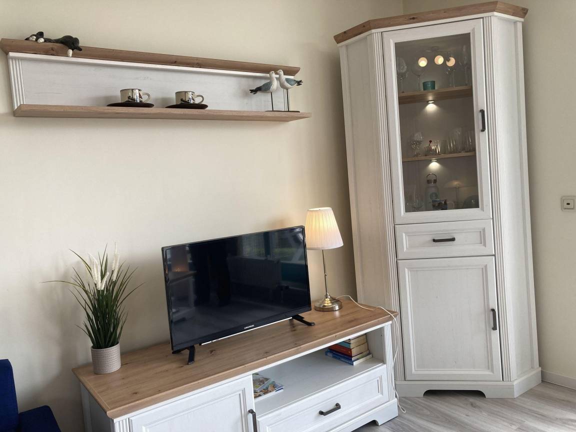 Die Ferienwohnung in der Strandhausvilla bietet auf 50 m² Platz für bis zu 2 Erwachsene und befindet sich im 2. Obergeschoss einer gepflegten Appartementanlage, nur ca. 150 m vom Sandstrand entfernt. Der Eingangsbereich verfügt über eine Garderobe. Der Wohnbereich ist mit einem 2-Sitzer- und Chaiselongue-Sofa sowie einem TV ausgestattet und bietet Zugang zu einem Balkon in Süd-Ostlage. Die integrierte Küche und der Essplatz mit Tisch und Stühlen laden zum Verweilen ein. Das Schlafzimmer ist mit einem Doppelbett (2 Einzelmatratzen, 90 x 200 cm) und einem Kleiderschrank ausgestattet. Das Badezimmer bietet eine Dusche und WC. Gemeinschaftlich nutzbare Einrichtungen im Keller umfassen eine Waschmaschine und einen Trockner (gegen Gebühr), einen Tischtennisraum und einen Abstellraum für Fahrräder.