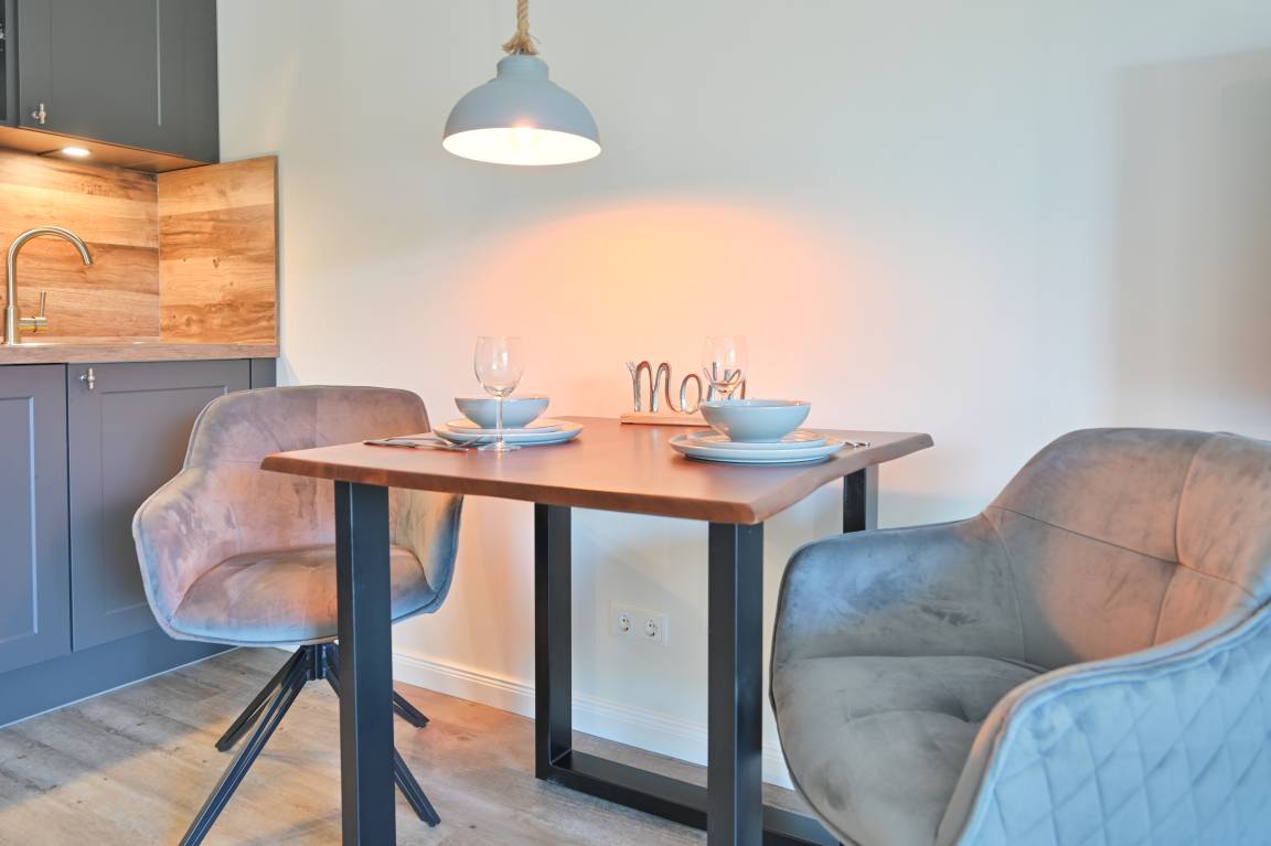 Das Wohnschlafzimmer mit Doppelbett, Nachttischen, integrierter Küchenzeile, Tisch und zwei Stühlen bietet Gästen wunderbare Möglichkeiten, es sich rundum gemütlich zu machen.