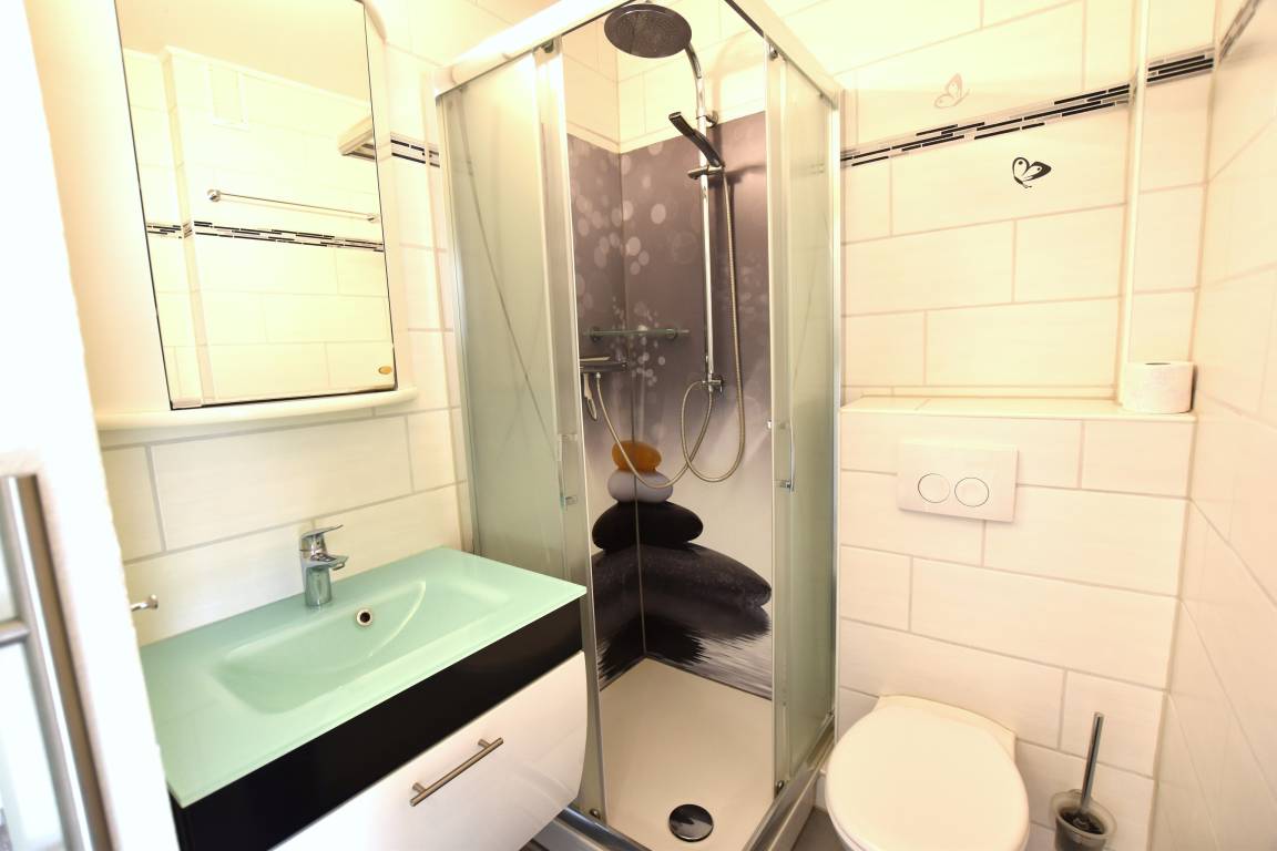 ein separates Schlafzimmer mit einem Doppelbett (1x160x200cm), einem Duschbad, Waschbecken und WC und einem großen Wohn/- Esszimmer mit neuer gut ausgestatter Küche, einer gemütlichen Schlafcouch (120x200cm), einem Esstisch mit Bestuhlung und großem LCD TV Gerät. Der an den Wohnbereich angrenzende Balkon ist mit Balkonmöbeln möbliert und befindet sich in südlicher Richtung.