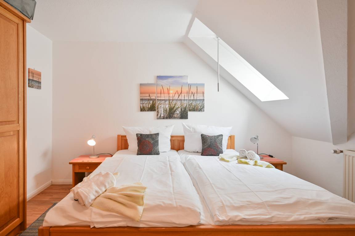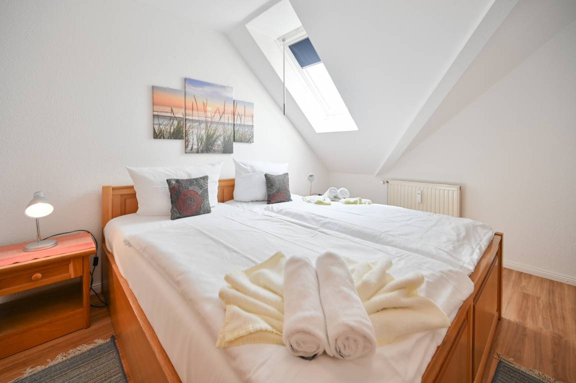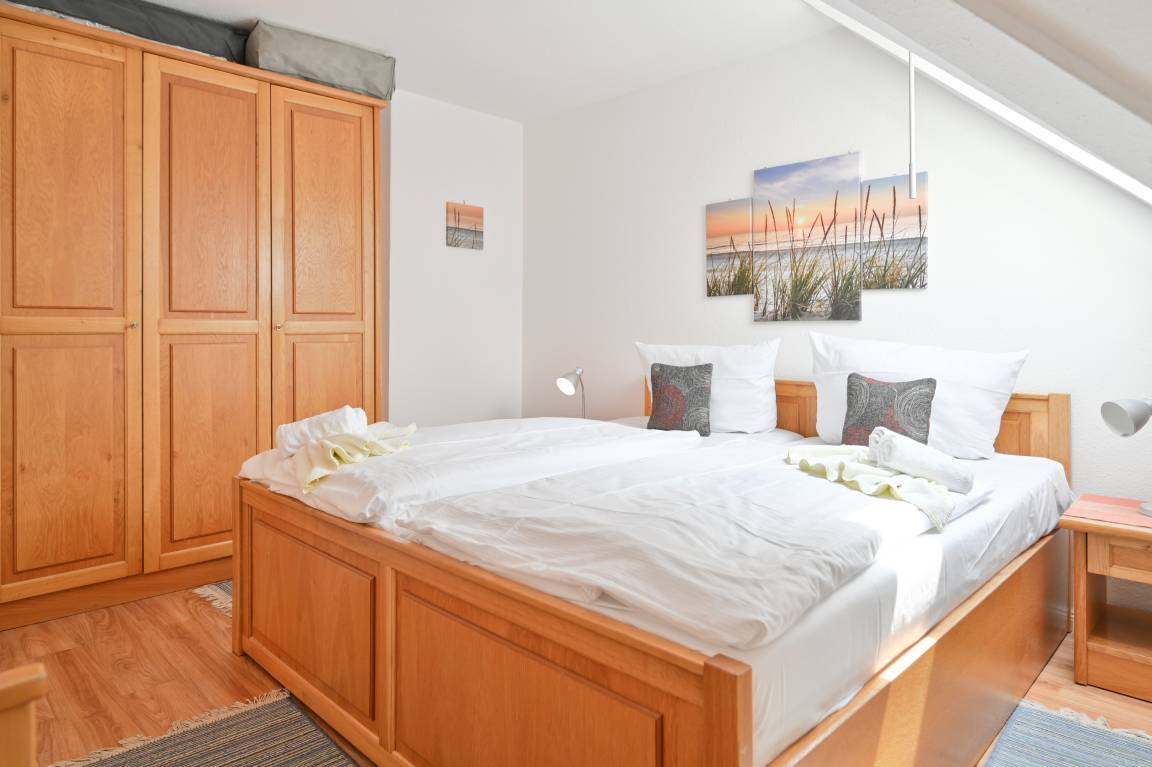 Die schöne Ferienwohnung verfügt darüber hinaus über ein separates Schlafzimmer mit Doppelbett und Nachttisch mit Radiowecker, 2 weiteren Stühlen zur Ablage oder als Reserve für den Essbereich.