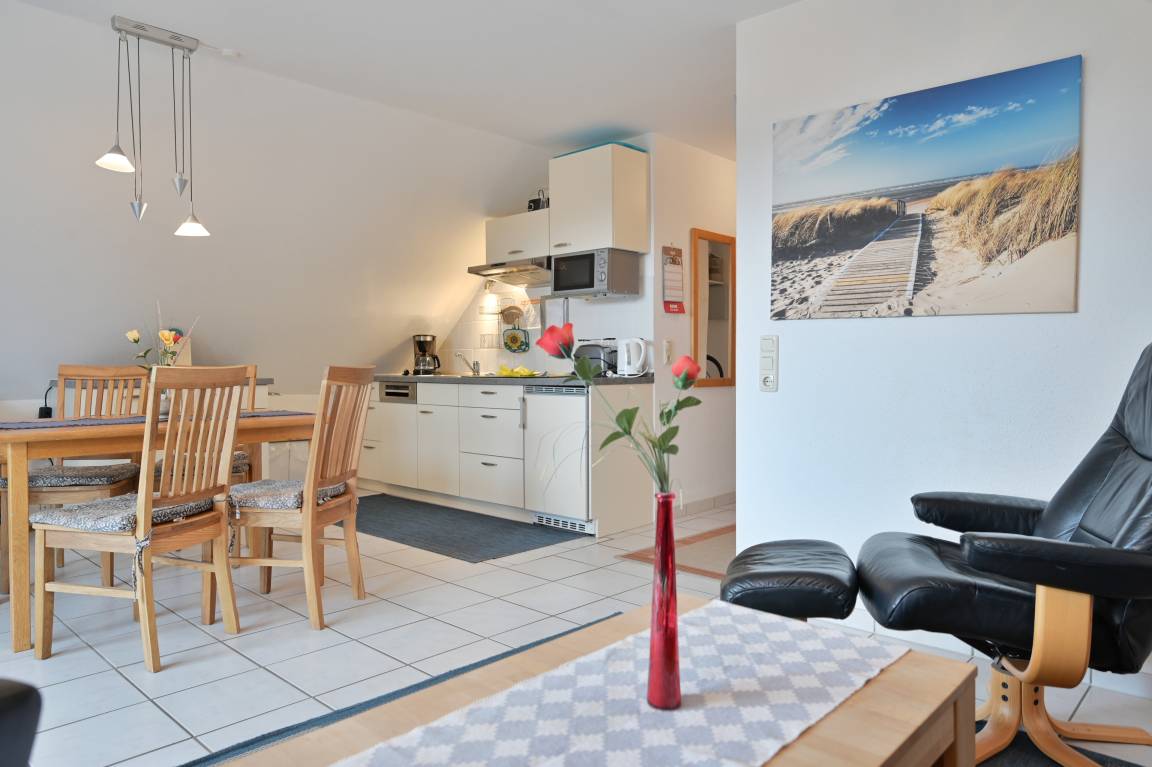 Außerdem befinden sich in der Wohnung ein Esstisch mit 4 Schwingstühlen, eine neue voll augestattete Küchenzeile (mit Spülmaschine, Mikrowelle, Kleinbackofen, Gefrierfach). Es besteht ein Zugang vom Wohnraum zum möblierten Süd-West-Balkon.