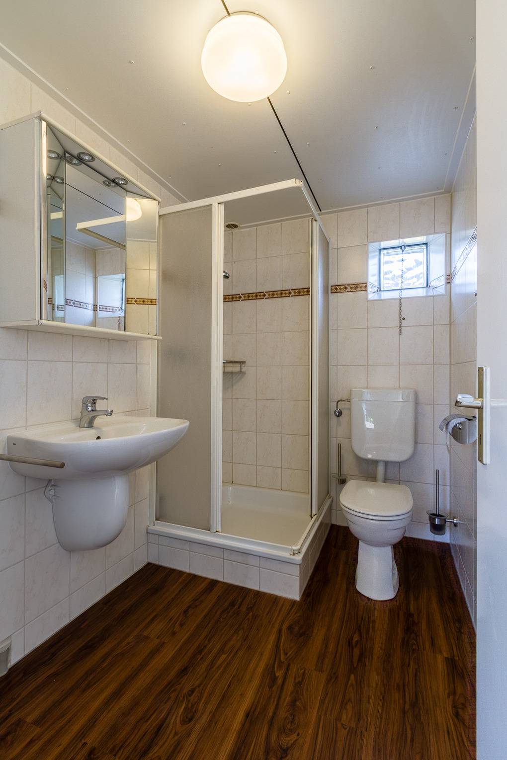 Ebenfalls angeschlossen an den Flur ist das helle, modernisierte Badezimmer mit WC, Dusche und Handtuchheizkörper.