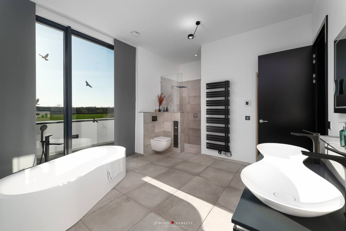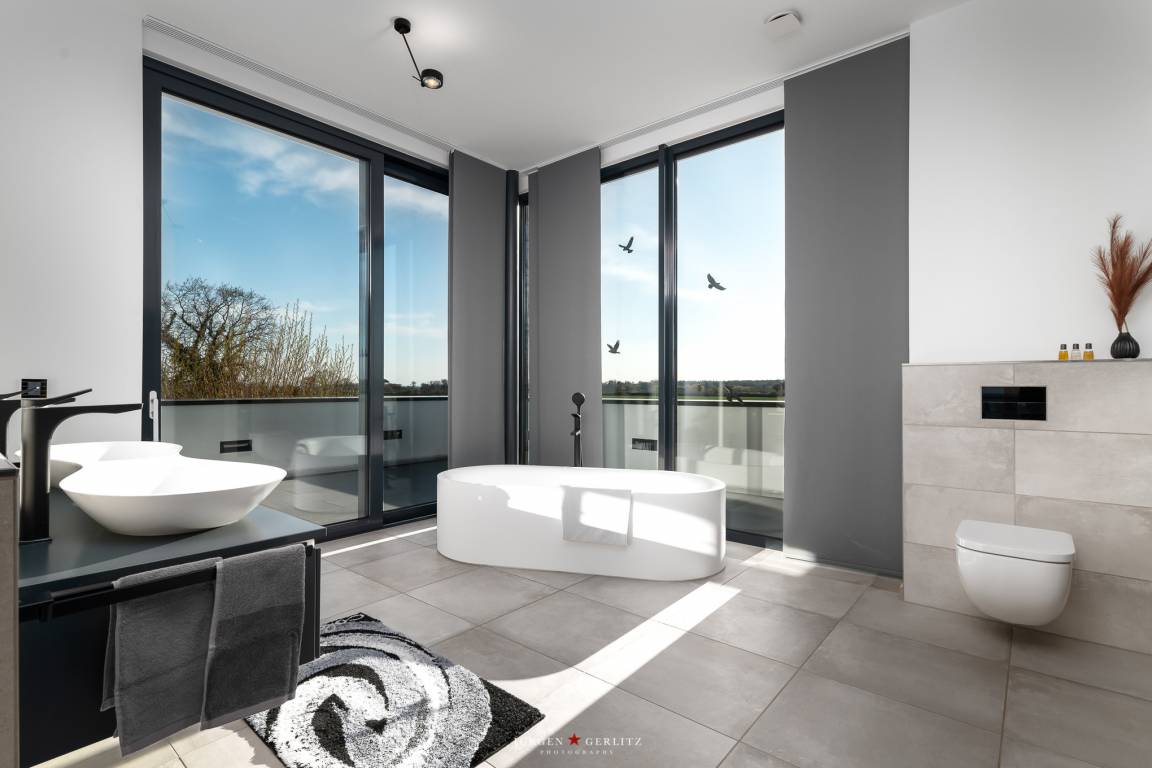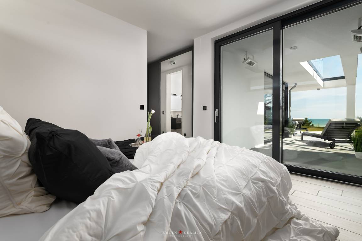- Schlafzimmer (3) mit Meerblick, Balkonzugang, Doppelbett (1x180 cm x 200 cm), Nachttische, Bettleuchten, Außen- und Innenrollo, TV, ein separates Duschbad mit freistehender Badewanne, Doppelwaschtisch mit Spiegel, Toilette, Balkonzugang und Saunabereich mit Meerblick.(3) und ein begehbarer Kleiderschrank.