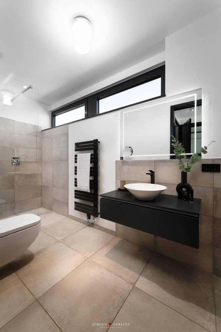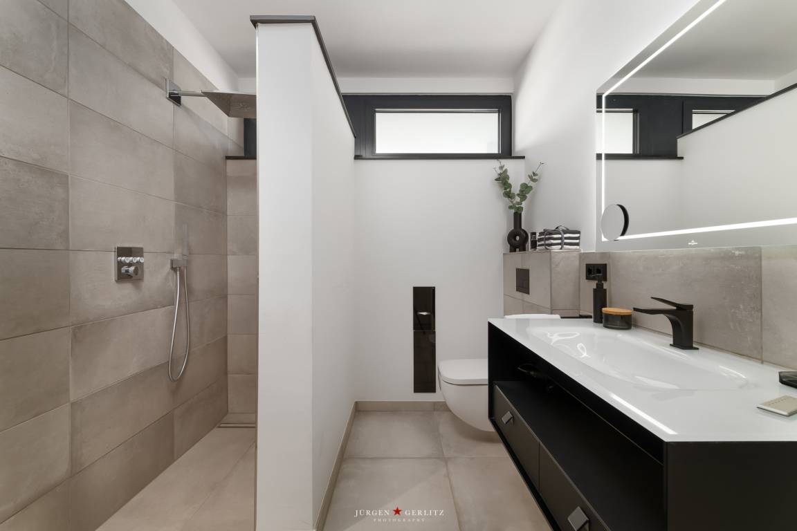 -eine Gästesuite mit barrierefreiem Duschbad (1) mit bodentiefer Dusche, Toilette und Waschtisch mit Spiegel, barrierefreies Schlafzimmer (1) mit Doppelbett (1x 180 cm x 200 cm), großer Kleiderschrank, Nachttische, Bettleuchten, Außenrollo und einem TV und Zugang zur Terasse.