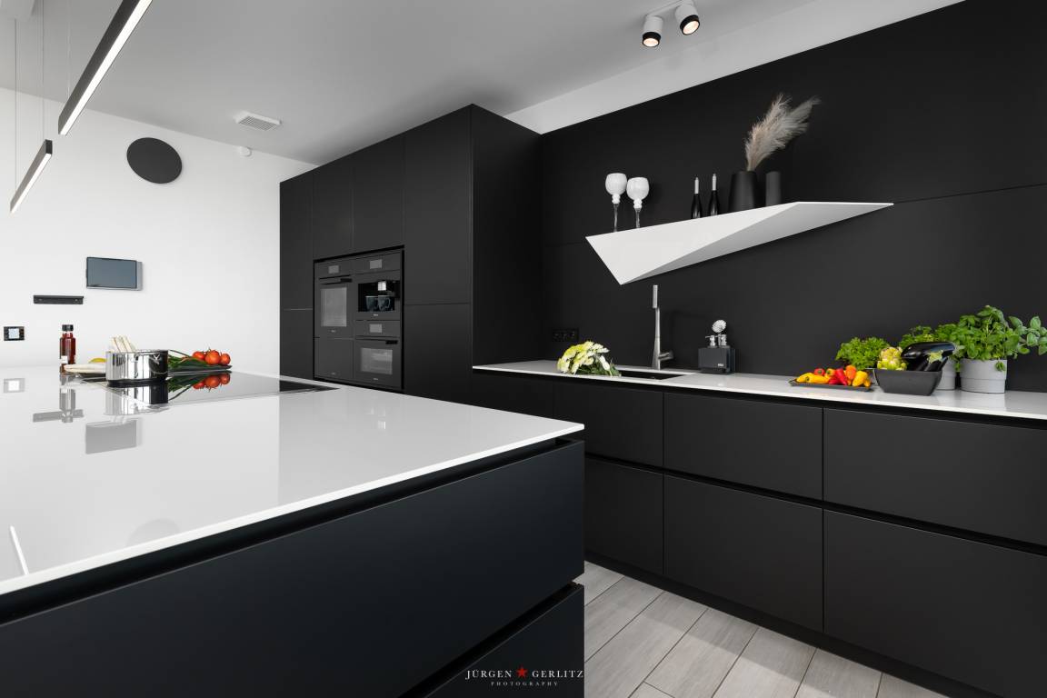 - eine offene Küche mit Backofen, Dampfgarer, Miele Kaffeevollautomat für ganze Bohnen, Wärmeschublade, 6-Platten-Induktionskochfeld, Geschirrspülmaschine, Kühlschrank und allen übrigen Küchenutensilien.
