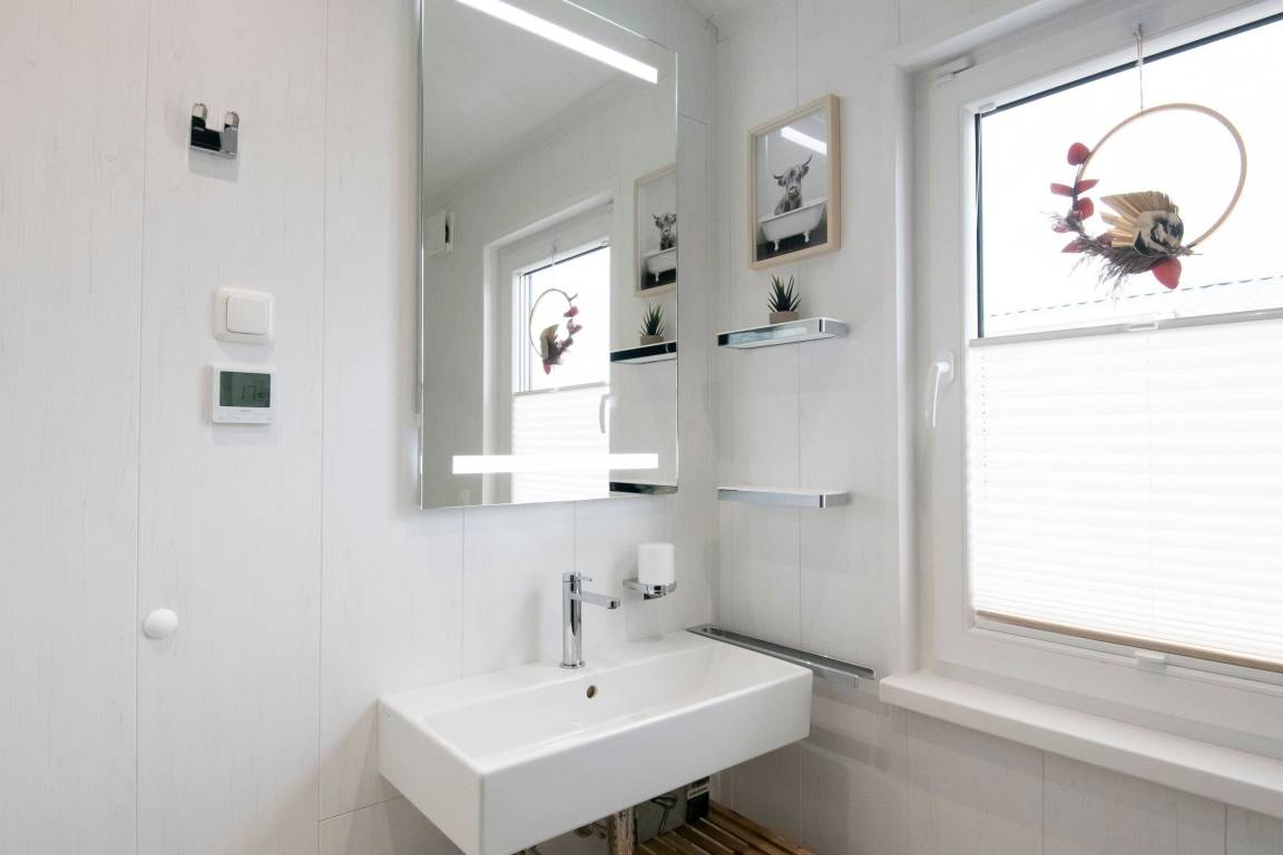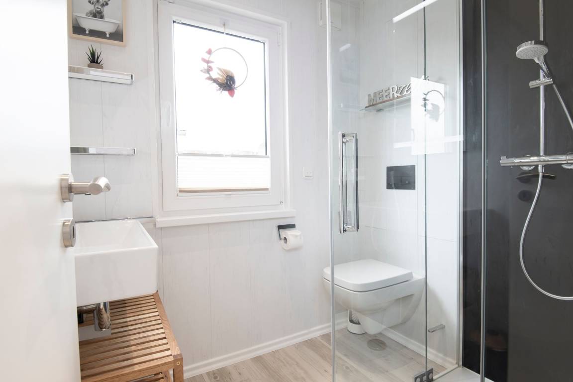 Unterteilt ist das Feriendomizil in ein Wohnzimmer mit Schlafsofa (Liegefläche 140x200 cm) und Smart TV, eine offene, gut ausgestattete Küche, 2 Schlafzimmer, sowie ein tageslichthelles Badezimmer mit bodentiefer Dusche, Fön und Handtuchheizung. Das erste Schlafzimmer ist mit komfortablem Boxspringbett (160x200 cm), Kleiderschrank, und Smart TV ausgestattet. Bei Bedarf ist auch Platz um ein Kinderreisebett aufzustellen. Das zweite Schlafzimmer umfasst 2 Einzelbetten (je 80 x 190 cm) und einen Kleiderschrank. Plissees und Außenrollos sorgen in allen Schlafräumen, sowie im Wohnzimmer für angenehme Verdunklung. Der eingezäunte Garten bietet mit möblierter Terrasse viel Raum zum Entspannen. Auch ein Grill ist vorhanden, genießen Sie gesellige Barbecue Abende oder entspannen bei einem stilvollen Sundowner und lauschen den Ostseewellen.