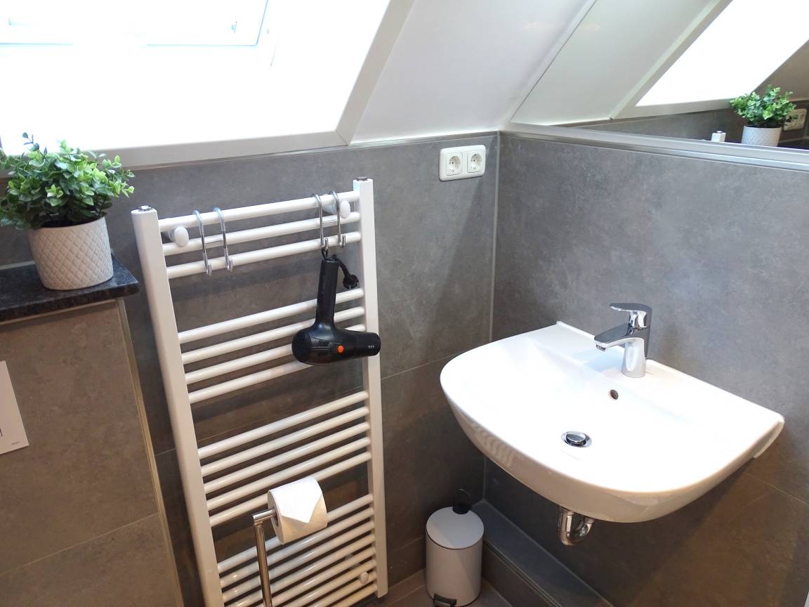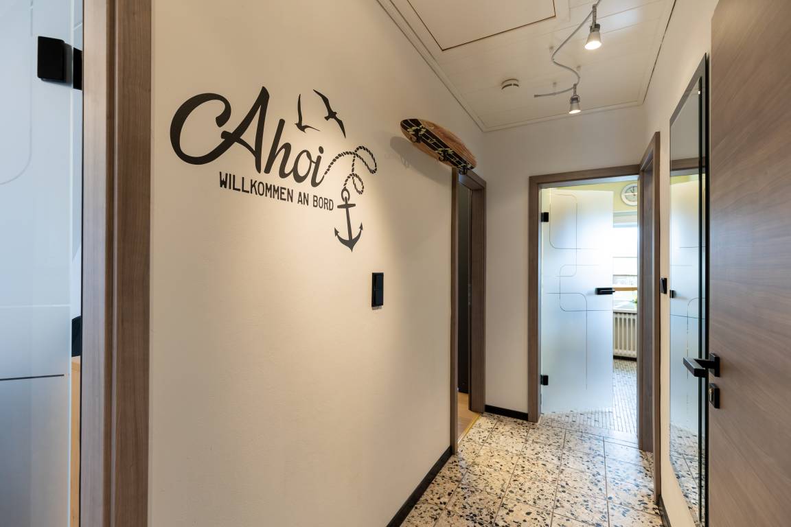 Die Ferienwohnung befindet sich im Obergeschoss des Ferienhauses, sie besteht aus einem Wohnzimmer mit Sofa, Sessel und Couchtisch, Esstisch mit 4 Stühlen und einer Anrichte, einer separaten Einbauküche mit Backofen und Ceranfeld, Kühlschrank mit Gefrierfach, Mikrowelle und Geschirrspüler. Zwei Schlafzimmer mit Doppelbetten und einmal mit Kinderbett. Beide Schlafzimmer verfügen über Kleiderschränke und Nachttische. Dusche mit WC, Flur mit Garderobe und Spiegel. Abstellraum für Fahrräder und Strandzubehör, Die Parkplätze befinden sich vor dem Haus. Ein großer Garten mit Wäschespinne steht Ihnen zur Verfügung. Sat-TV, Musikanlage mit DVD/CD, W-Lan und Briefkasten.