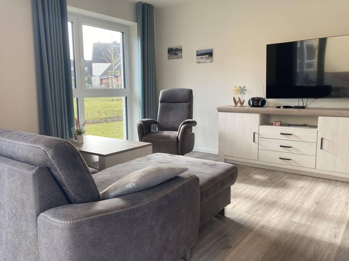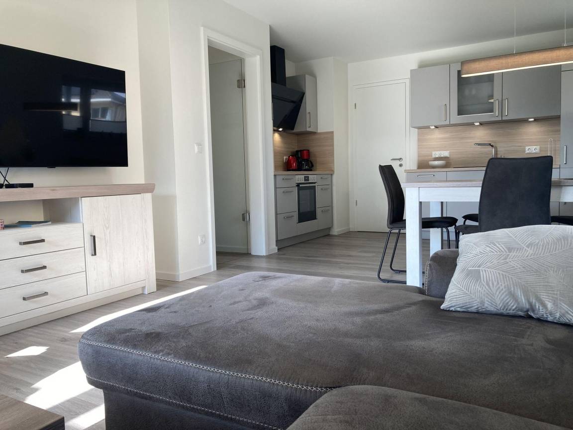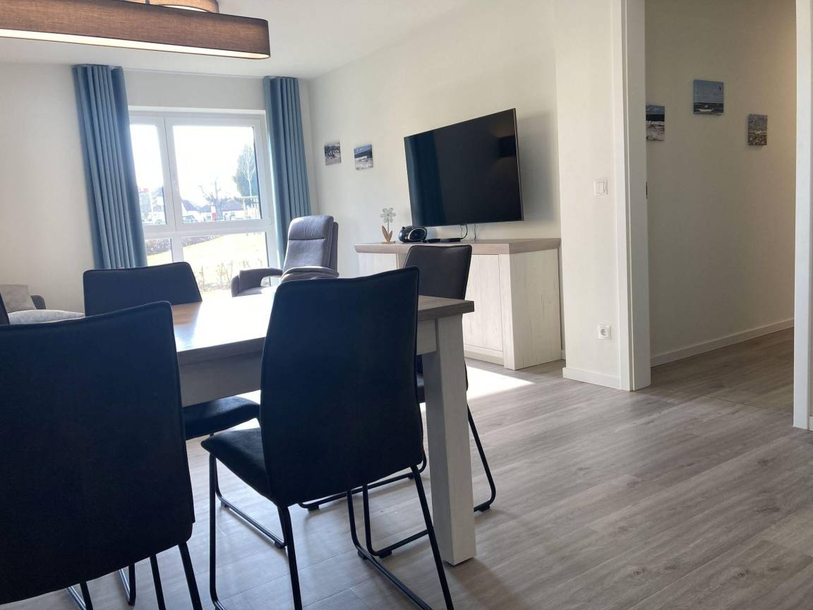 Die Ferienwohnung "Dahmer Dünen – AuszeitOstsee" bietet auf 88 m² ein modernes Drei-Zimmer-Appartement im Erdgeschoss, nur 300 m vom Dahmer Sandstrand entfernt. Der helle Wohnraum ist mit einem Sofa, einem Sessel und einem Flatscreen-Smart-TV ausgestattet und schließt eine offene, voll ausgestattete Küche mit Essplatz für vier Personen ein. Zwei Schlafzimmer verfügen jeweils über hochwertige Boxspringbetten (180 cm x 200 cm) und Kleiderschränke; eines besitzt zusätzlich einen Smart-TV. Das geräumige Tageslichtbad bietet eine bodentiefe Dusche und eine Sauna. Ein separates Gäste-WC sowie ein Abstellraum sind ebenfalls vorhanden. Die große, überdachte Terrasse lädt zum Entspannen ein und die Fußbodenheizung schafft stets wohlige Temperaturen. WLAN und ein PKW-Stellplatz gehören ebenfalls zur Ausstattung. Der gemeinschaftlich nutzbare Fahrradabstellplatz befindet sich auf dem Grundstück. Haustiere sind nicht erlaubt und das Rauchen ist untersagt.