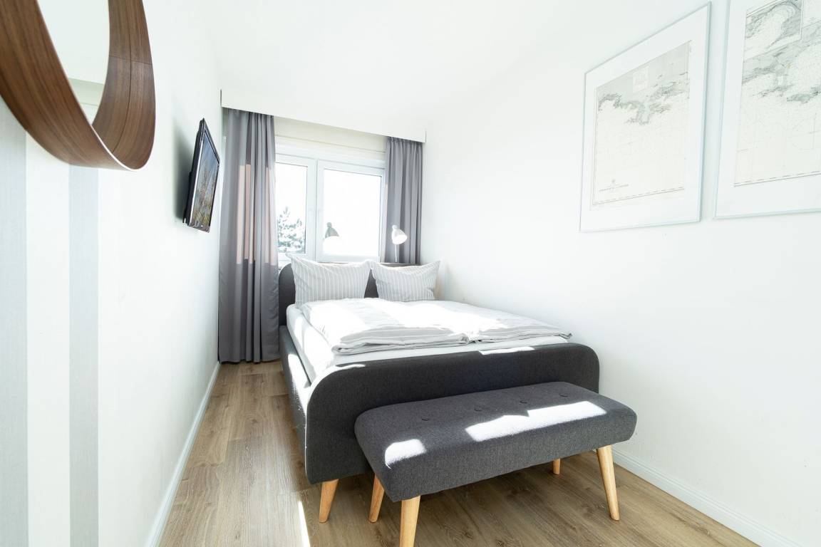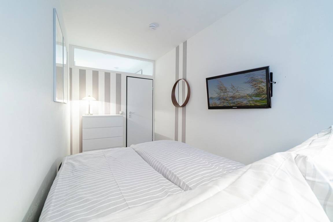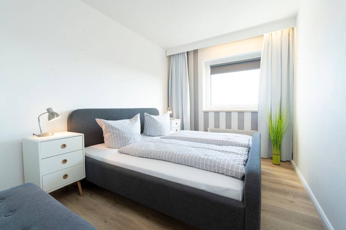 Der moderne Wohn- und Essbereich ist durch die große Fensterfront stets hell und lichtdurchflutet. Dieser Bereich setzt sich aus der modernen Küche inklusive Geschirrspüler, Espressomaschine, einem Esstisch für 6 Personen sowie einem Ecksofa mit Schlaffunktion (140x200 cm) zusammen. Vom Küchenfenster können Sie den Ostsee-Fernblick genießen. Ein Flachbildfernseher im Wohnbereich für gemütliche Abende fehlt natürlich nicht. Beide separate Schlafzimmer sind mit komfortablen Doppelbetten (180x200 cm) ausgestattet und verfügen über ein Fenster. In einem Schlafzimmer steht Ihnen ein weiterer Fernseher zur Verfügung. Der große Süd-Balkon im Wohnbereich verwöhnt Sie den ganzen Tag bis in den frühen Abend mit Sonne, für Abwechslung auf dem Speiseplan sorgt ein vorhandener Elektrogrill. Ein Hochstuhl für die Kleinen gehört kostenfrei zur Grundausstattung genauso wie Fliegengitter an allen Fenstern. Der WLAN-Anschluss ist selbstverständlich inklusive. Eine Waschmaschine zur Eigennutzung ist vorhanden.