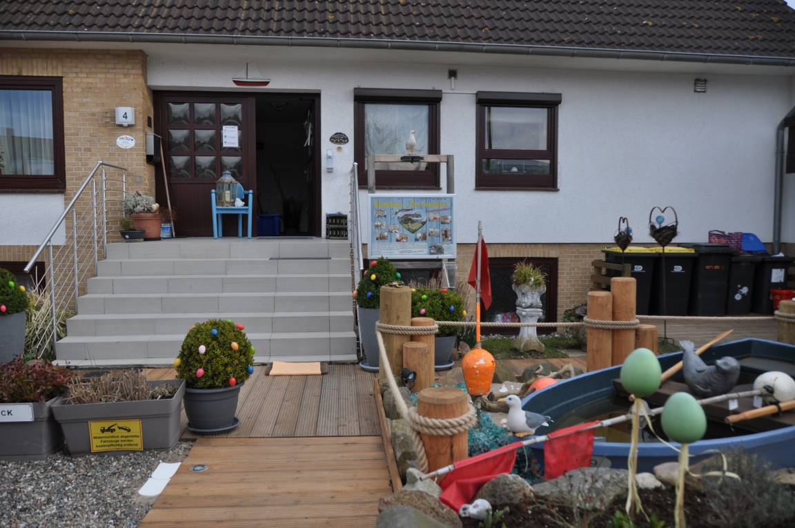 Unsere ruhige Ferienwohnung Nr. 4 "Muschel" befindet sich in der 1. Etage und bietet genügend Raum, um sich wohl zu fühlen. Das Schlafzimmer mit Doppelbett, sowie das große geräumige Wohn-/Esszimmer mit Einbauküche, dem großen Badezimmer mit DU/WC sind mit viel Liebe zum Detail eingerichtet worden. Die Sonne verwöhnt Sie den ganzen Tag auf Ihren Balkon. Das Schlafzimmer mit Doppelbett bietet ein komfortables Schlafen. Dazu dienen gute Bandscheibenmatratzen, eine große Anzahl an Kopfkissen und Zudecken. Die Küchenzeile ist bestückt mit einem Glas - Keramik-Herd Spülmaschine, Kühlschrank mit Gefrierfach, Backofen, Mikrowelle und allen notwendigen Elektrogeräten sowie einer großzügigen Haushaltsbestückung. Reinigungsartikel für Küche und Bad stehen für Sie allzeit bereit.
