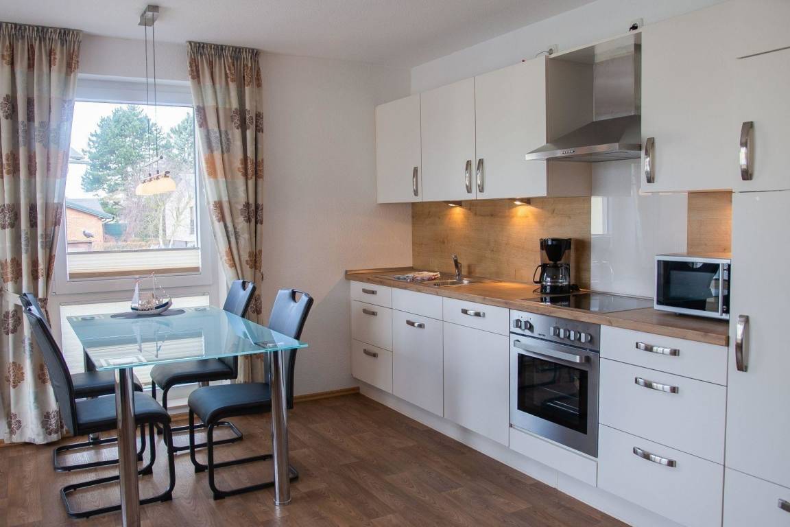Die Ferienwohnung "Seemöwe" im Haus Meeresglück bietet auf 75 m² Platz für bis zu 4 Erwachsene und einen Hund. Sie verfügt über ein modernes, helles Wohnzimmer mit Essbereich und einer offenen, voll ausgestatteten Küche. Vom Wohn- oder Schlafzimmer aus ist ein großer Balkon erreichbar. Es stehen zwei Schlafzimmer mit je einem Doppelbett und Kleiderschrank zur Verfügung. Das tageslichthelle Badezimmer ist mit einer ebenerdigen Dusche und WC ausgestattet, zusätzlich gibt es ein Gäste-WC. Im Keller des Haupthauses können eine Waschmaschine und ein Trockner gegen Gebühr genutzt werden. Ein PKW-Stellplatz direkt am Haus sowie Abstellmöglichkeiten für Fahrräder im Keller sind ebenfalls vorhanden. WLAN ist in der gesamten Wohnung verfügbar. Ein reservierter Strandkorb kann in der Strandkorbvermietung Krebs genutzt werden.