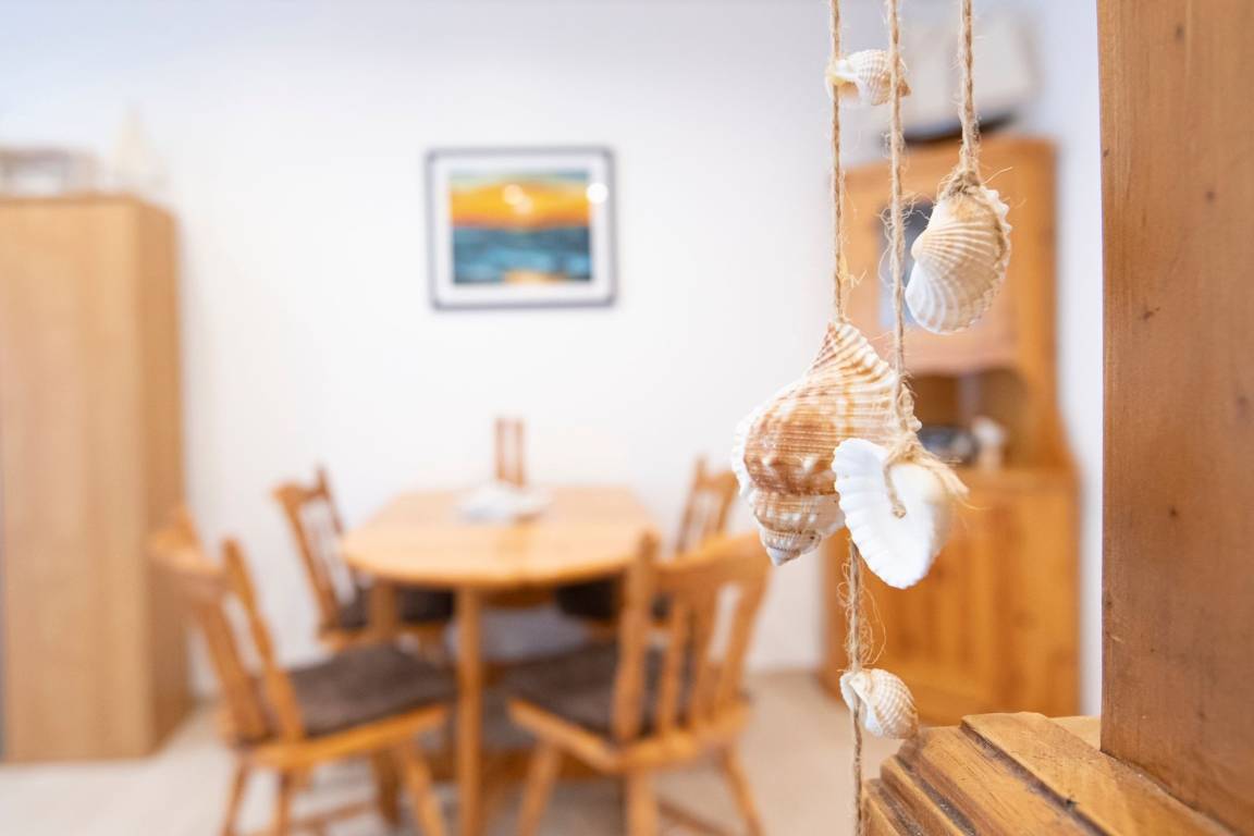 Genießen Sie die gemeinsame Zeit auf dem Sofa vor dem Flachbild-TV oder beim Spielen am Esstisch. Besonders punkten kann dieses Feriendomizil mit einer eigenen Terrasse mit kleinem Garten, auf der Sie je nach Wetterlage das Meer rauschen hören können. Tisch und Stühle, Sonnenliegen mit Auflagen und ein Elektrogrill warten schon auf Sie. Eine gut ausgestattete, offene Pantry-Küche mit Mikrowelle, Backofen und rustikalem Tresen steht Ihnen zur Zubereitung Ihres Frühstücks oder leckeren Mahlzeiten zur Verfügung. Komfortabel schlafen können Sie im großen Doppelbett (2x 90x200 cm) im Schlafzimmer mit Kleiderschrank für Ihre Urlaubsgarderobe. Das Wohnzimmer und das Schlafzimmer lassen sich zur Nacht mit Außenjalousien angenehm verdunkeln. Die Ausstattung der Wohnung wird durch das Duschbad komplettiert.
