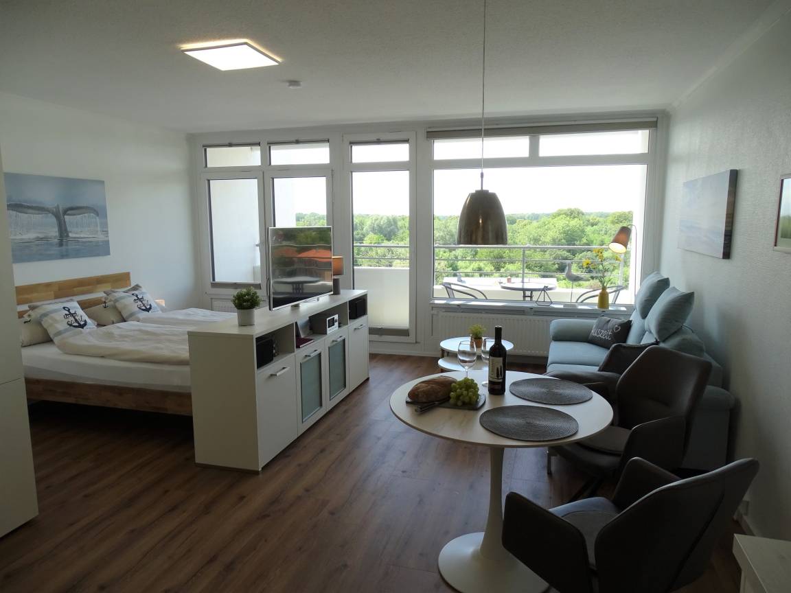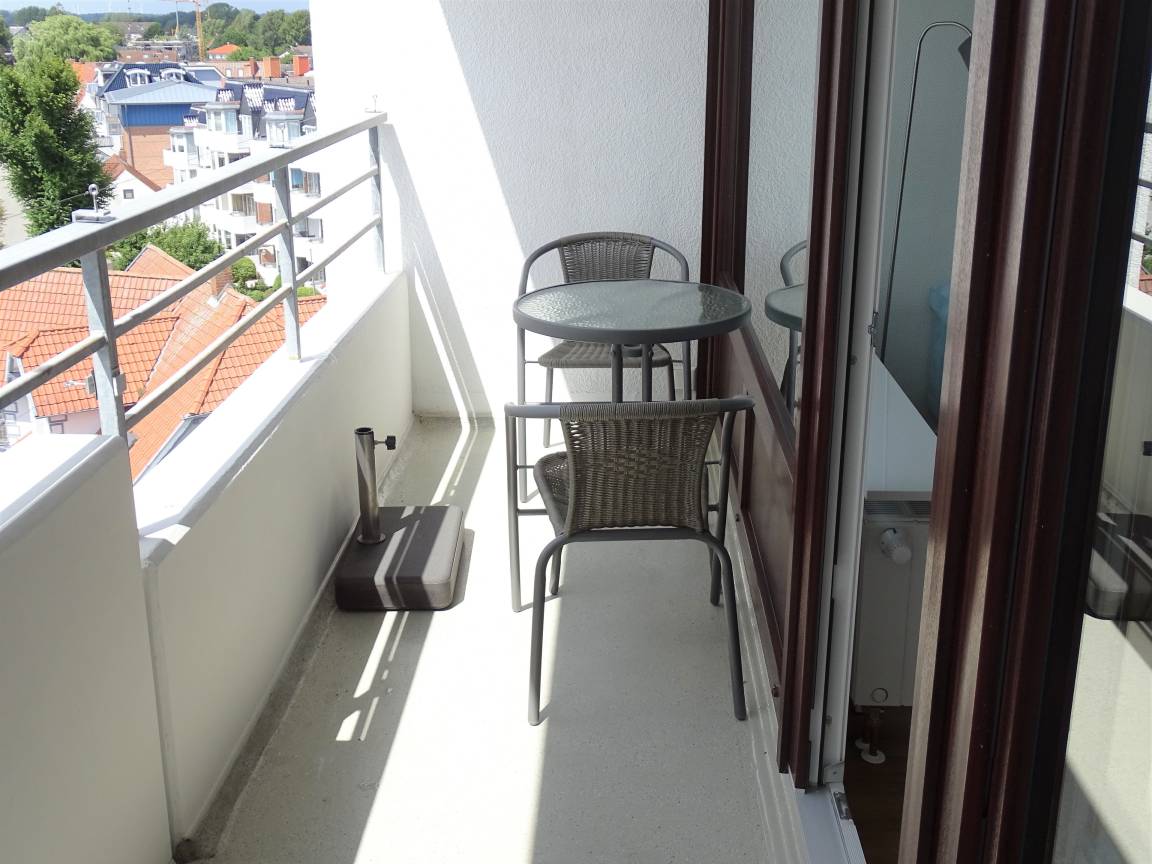 Zwischen Küche und Wohnzimmer gibt es einen Essplatz für 2 Personen. Das gemütliche Sofa mit Leselampe lädt zum Verweilen ein. Eine Vitrine mit TV (43 Zoll) und Stereo-Anlage dient als Raumteiler. Der TV ist drehbar so dass Sie bequem vom Sofa oder auch vom Bett fernsehen könnten. Das Doppelbett hat eine Größe von 1,60 x 2,00, die Matratzen-Seiten haben unterschiedliche Härtegrade. Die Einbauschränke bieten reichlich Platz für Staubsauger, Besen & Co, sowie für Ihre Kleidung. Der Balkon ist mit Tisch und Stühlen, Sonnenschirm und Schirmständer ausgestattet. Hier können Sie den Tag in der Abendsonne ausklingen lassen.