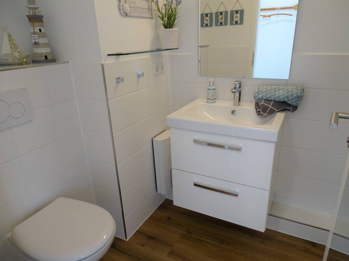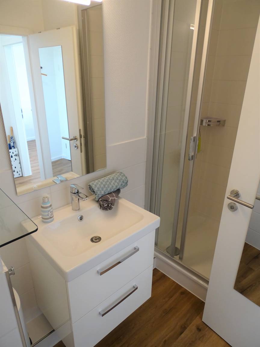 Im Duschbad gibt es eine Handtuchtrockner-Heizung, Schrank, Regale und einen Föhn.