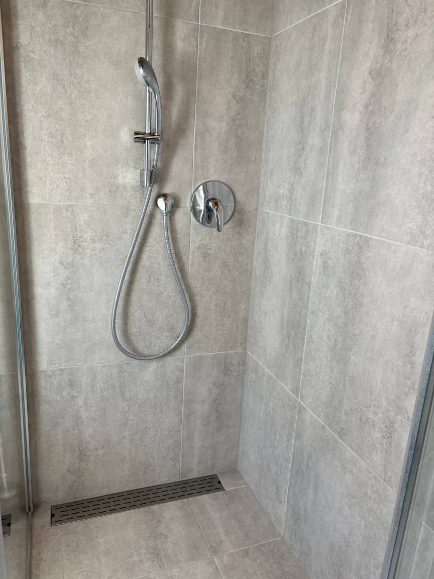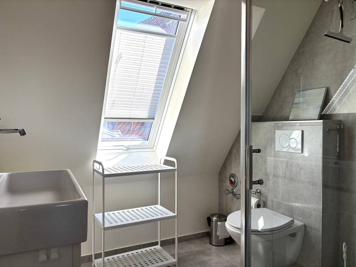 Es gibt eine kleine Dachterrasse - ( 2 Stühle ) mit einem Blick auf's Meer. Im Bad befindet sich eine ebenerdige Dusche.