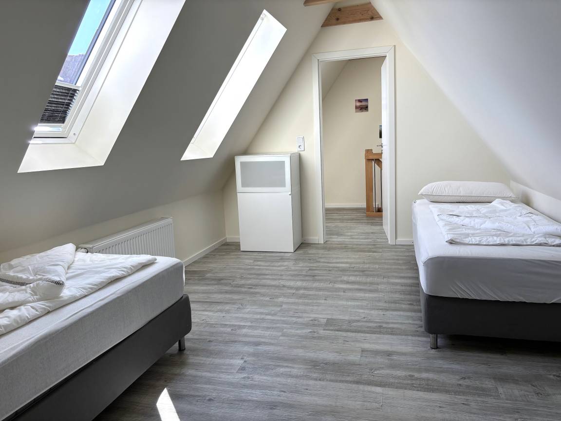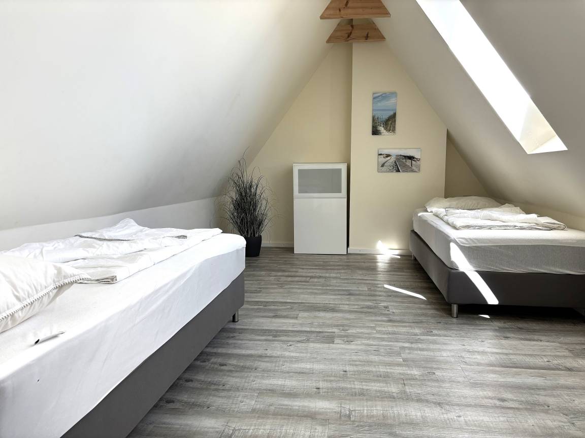 Das zweite Schlafzimmer befindet sich im Dachgeschoss und ist mit 2 Einzelbetten ausgestattet. Die Betten sind individuell verschiebbar . Schlafzimmerfensterverdunklung durch Plissees.
