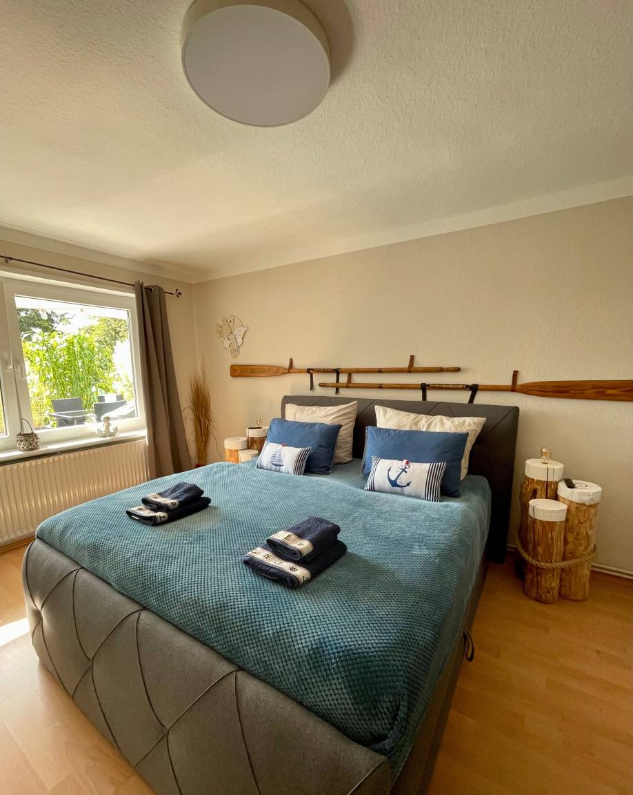 Sie verfügt über 1 Schlafzimmer mit Boxspringbett (180x200cm), Kommode und TV Gerät. Hier ist auch noch ausreichend Platz für ein Kinderreisebett. Das Wohnzimmer ist mit einer TV- Wand und Couchgarnitur sowie Zugang zur möblierten Terrasse mit Gasgrill ausgestattet. Die komplett ausgestattete Küche mit offenem Esszimmer mit TV lässt keine Wünsche offen, neben Kühlschrank mit Gefrierfach befinden sich Backofen, Ceranfeld, Geschirrspüler und Mikrowelle in ihr. Das Badezimmer ist mit begehbarer Dusche,Badewanne, Handtuchheizkörper, Fußbodenheizung und WC ausgestattet. Als Fußbodenbeläge sind ein Vinylboden in der Küche, Bad und Flur und in den Wohnräumen Laminat verlegt. Vor dem Haus befindet sich ein eigener Kfz- Stellplatz. Fahrräder können in der Holzhütte untergestellt werden. Für Hundebesitzer sind der nahegelegene Wald und der Hundestrand im Süden des Ortes ideal.