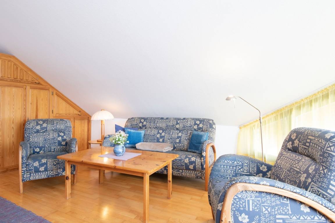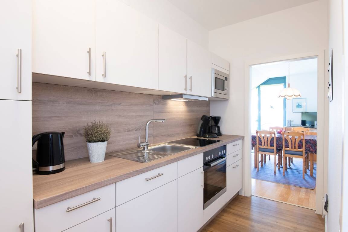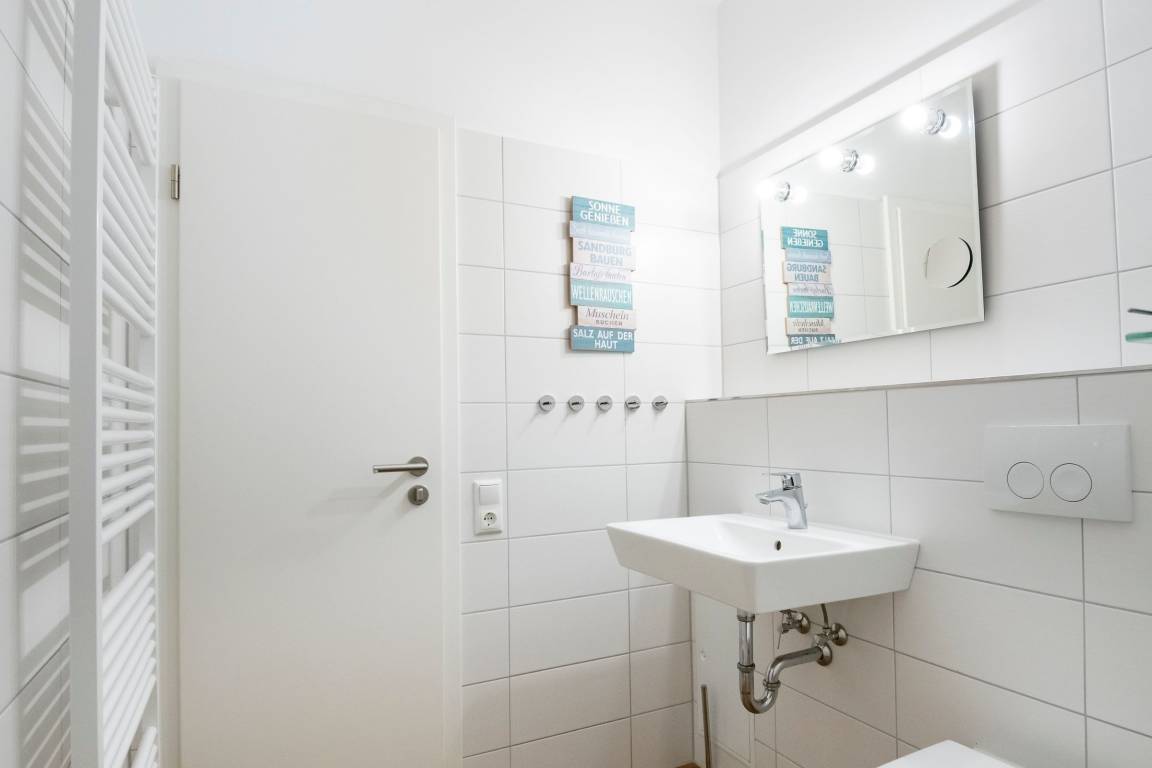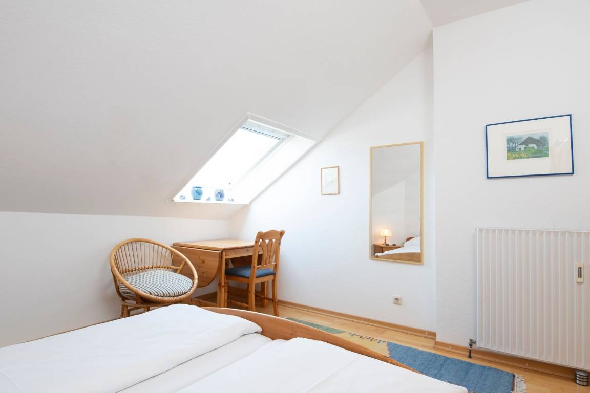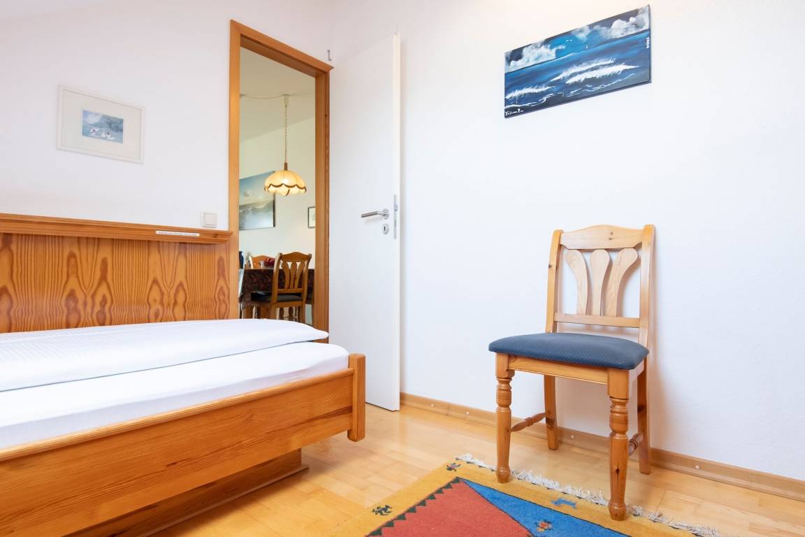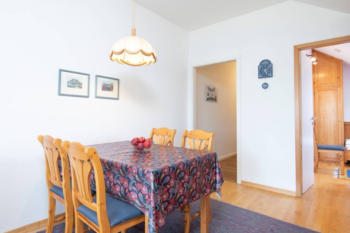 Der Flur hält ausreichend Stauraum für Ihre Jacken und Schuhe bereit. Der Wohn- und Essbereich ist geräumig und durch die große Fensterfront stets hell und lichtdurchflutet. Nehmen Sie Platz auf dem gemütlichen Sofa oder einem der zwei bequemen Sessel und lassen Sie die Abende vor dem Fernseher ausklingen. Vom Wohnbereich aus gelangen Sie auf den kleinen, möblierten Südbalkon, der zu erholsamen Stunden einlädt. Die moderne Küche mit hellen Fronten ist z. B. mit einem 4-Platten-Cerankochfeld, einem Geschirrspüler und einer Senseo-Kaffeemaschine gut ausgestattet. Die Wohnung verfügt über zwei separate Schlafzimmer: Eines mit einem Doppelbett (2x 90x200 cm) und eines mit zwei getrennt stehenden Einzelbetten (je 90x190 cm). Die Velux-Fenster in beiden Schlafzimmern lassen sich durch elektrische Rollläden angenehm abdunkeln, sodass Sie im Urlaub Ihren wohlverdienten Schlaf erhalten. Im innenliegenden, hell gefliesten Badezimmer erwartet Sie eine Dusche und sogar ein beheizbarer Handtuchhalter. Der WLAN-Anschluss ist selbstverständlich inklusive. Zusätzlich steht Ihnen der gemeinschaftlich genutzte Garten für eine ausgiebige Runde Federball oder gesellige Stunden im Freien zur Verfügung.