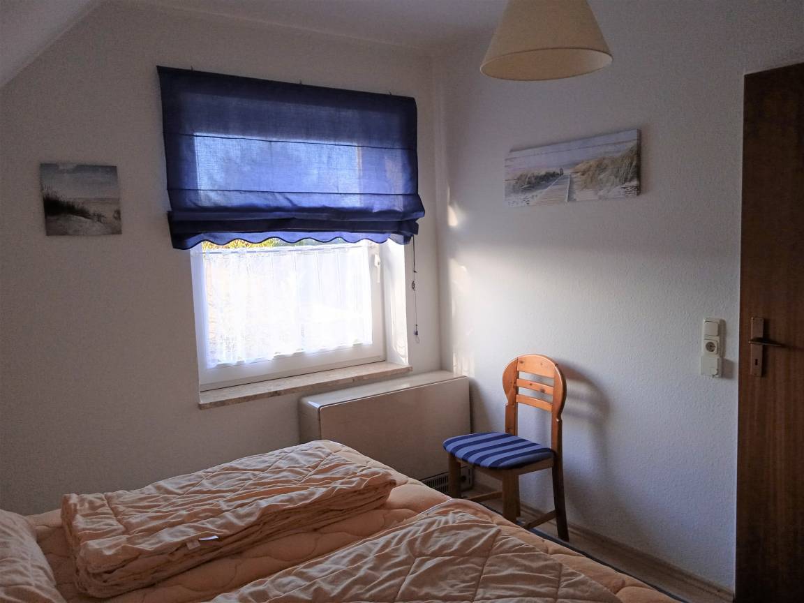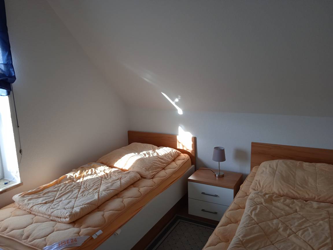 Es verfügt über 2 separate Schlafzimmer (ca. 14m² und ca. 12m²) in der 1. Etage, die Ende 2022 renoviert wurden. In dem größeren Schlafzimmer befindet sich das Doppelbett (1,80m x 2m), in dem Kleineren sind 2 Einzelbetten (2m lang). Es stehen synthetische Bettdecken und Kopfkissen zur Verfügung.