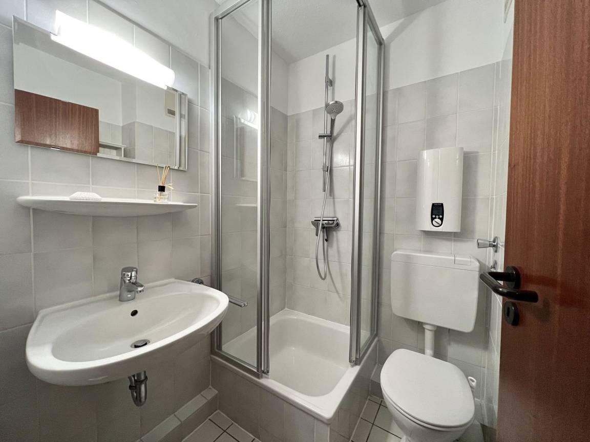 Das einladende Ein-Zimmer-Appartement im Ferienwohnpark bietet auf 34 m² Platz für zwei Personen. Der Eingangsbereich ist mit einer Garderobe ausgestattet. Der Wohnbereich verfügt über eine gemütliche Sofaecke, TV und WLAN. Der Schlafbereich ist mit einem komfortablen Schrankbett (160x200 cm) ausgestattet, das tagsüber Platz spart. Das Badezimmer bietet eine Dusche und einen Haartrockner. In der voll ausgestatteten Küchenzeile stehen ein Backofen, ein 2-Platten-Ceranfeld, ein Kühlschrank mit Gefrierfach und eine Mikrowelle bereit. Ein kleiner Essplatz für zwei Personen am Fenster sowie der direkte Zugang zum Balkon runden die Ausstattung ab. Waschmaschine und Trockner stehen gegen Gebühr zur gemeinschaftlichen Nutzung im Kellergeschoss der Wohnanlage zur Verfügung. Der Stellplatz Nr. 10 befindet sich direkt am Haus.